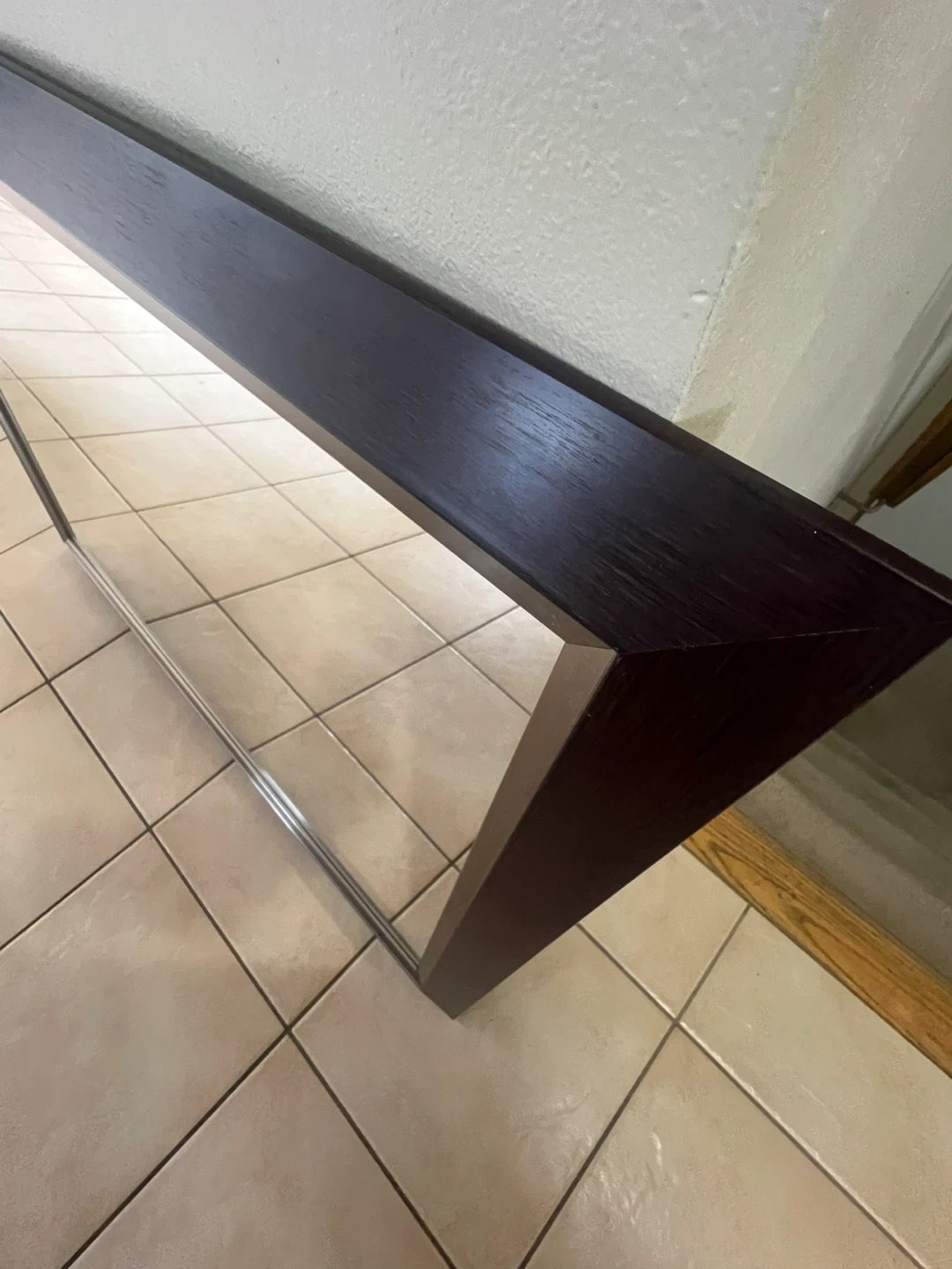 This is a stylish mirror with a dark wood frame and a sleek metal accent. It would be a great addition to an entryway or hallway. It's ready to hang!