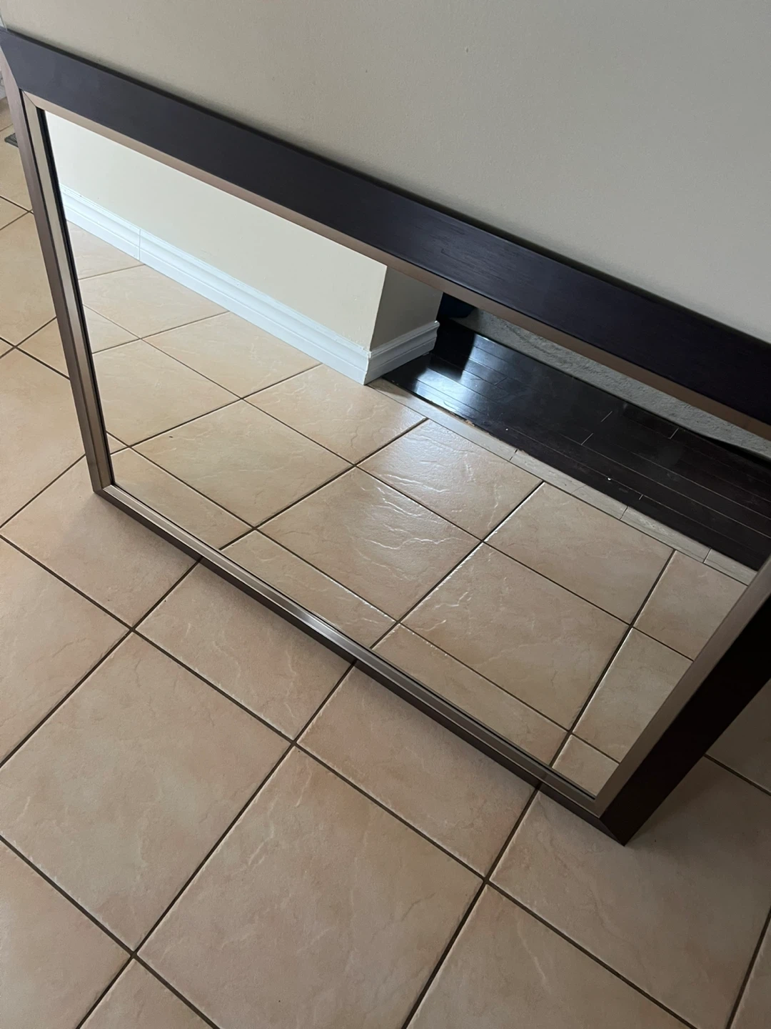 This is a stylish mirror with a dark wood frame and a sleek metal accent. It would be a great addition to an entryway or hallway. It's ready to hang!