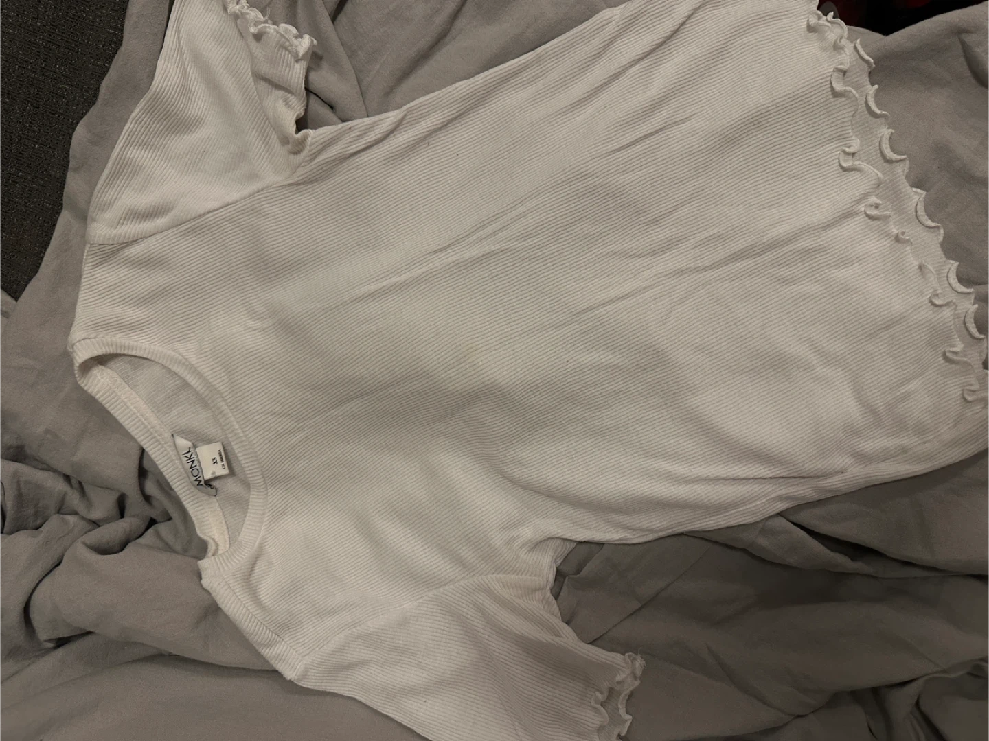 This is a white ribbed t-shirt from Monki. It features a lettuce hem on the sleeves and bottom hem. The material is stretchy and comfortable.