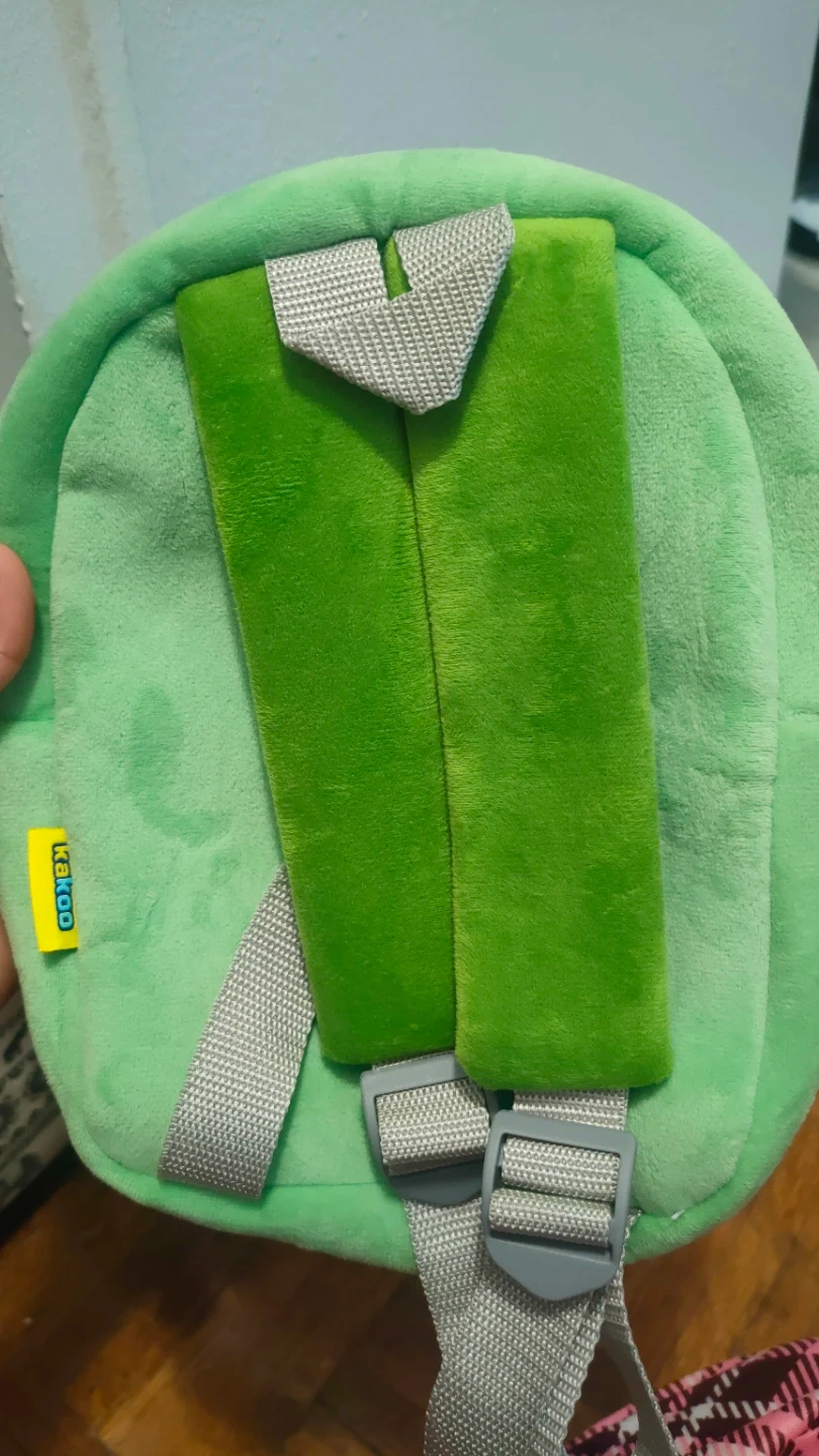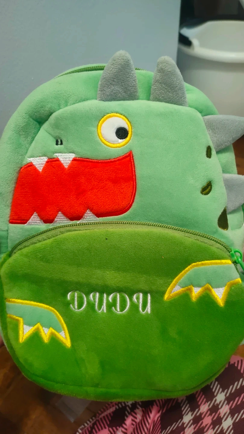 This is a cute green dinosaur backpack by Kakoo. It's made of soft plush material and has "DUDU" embroidered on the front pocket. Perfect for little ones heading to daycare or on a fun outing!
