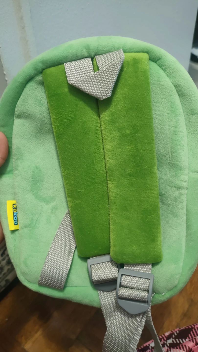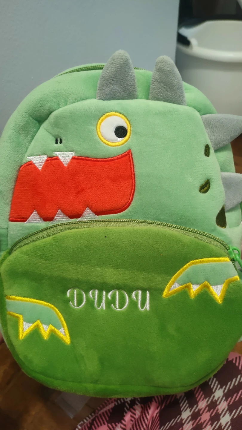 This is a cute green dinosaur backpack by Kakoo. It's made of soft plush material and has "DUDU" embroidered on the front pocket. Perfect for little ones heading to daycare or on a fun outing!