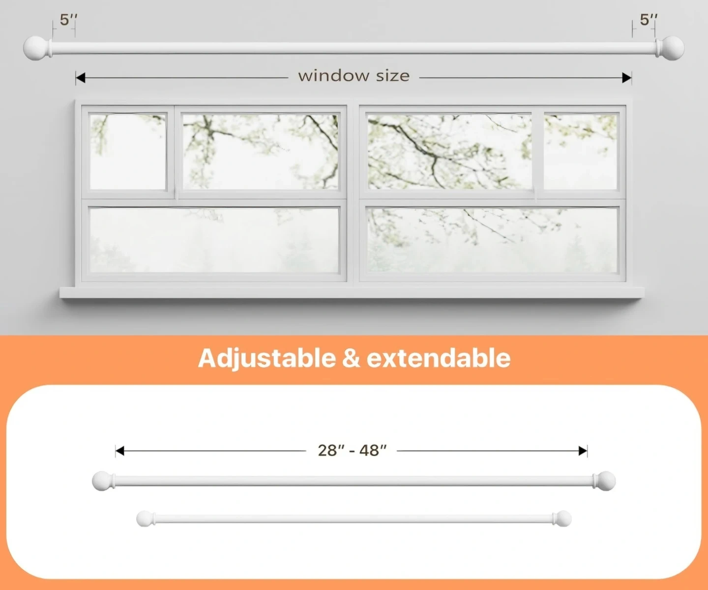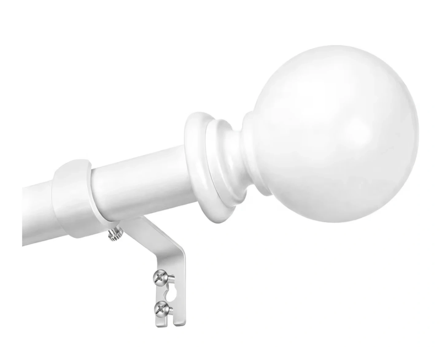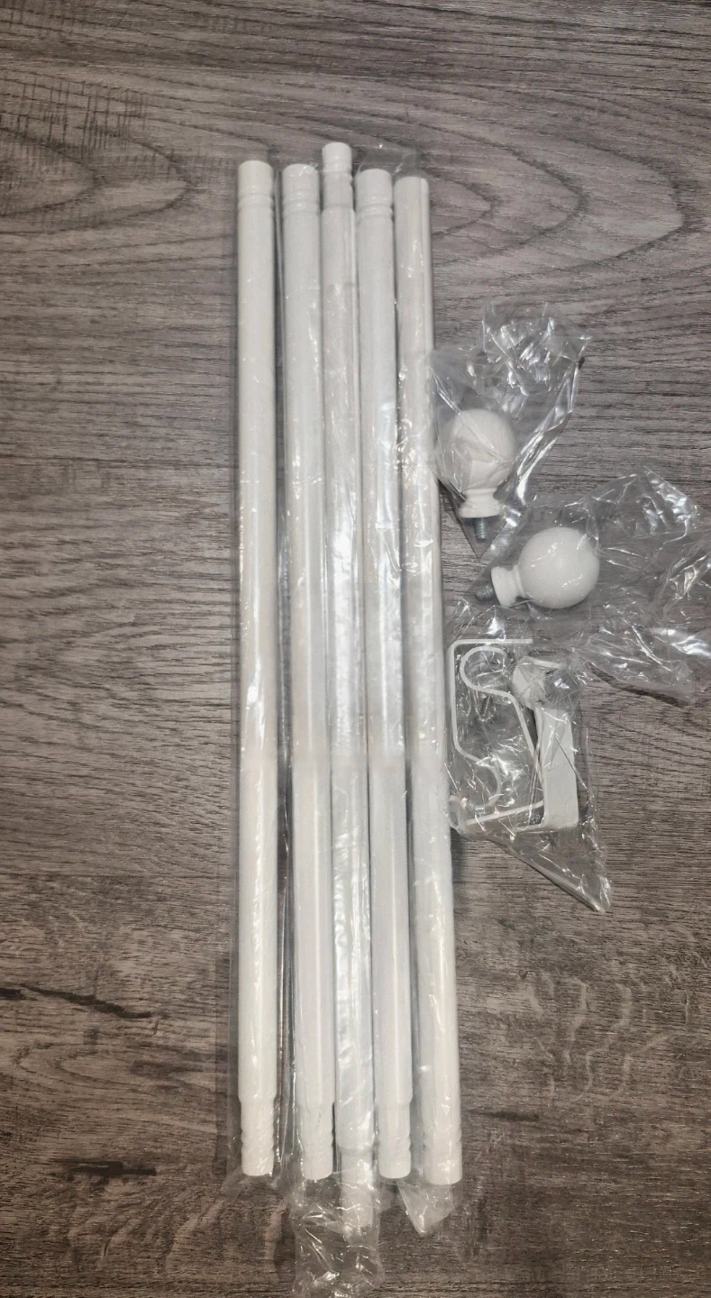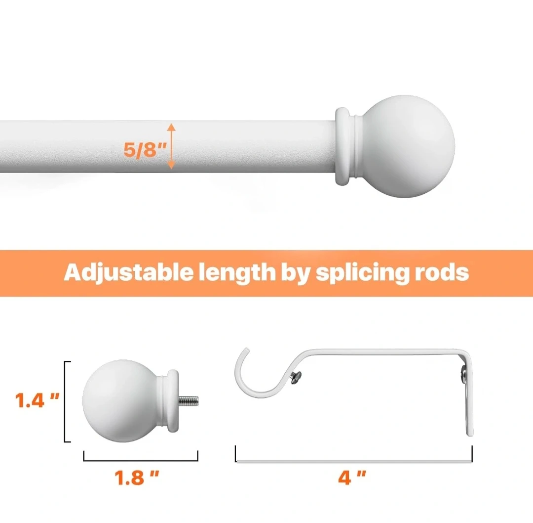 White adjustable curtain rod. New. Extends from 28 to 48 inches. Includes mounting brackets and hardware. Rod diameter is 5/8". Have multiple available.