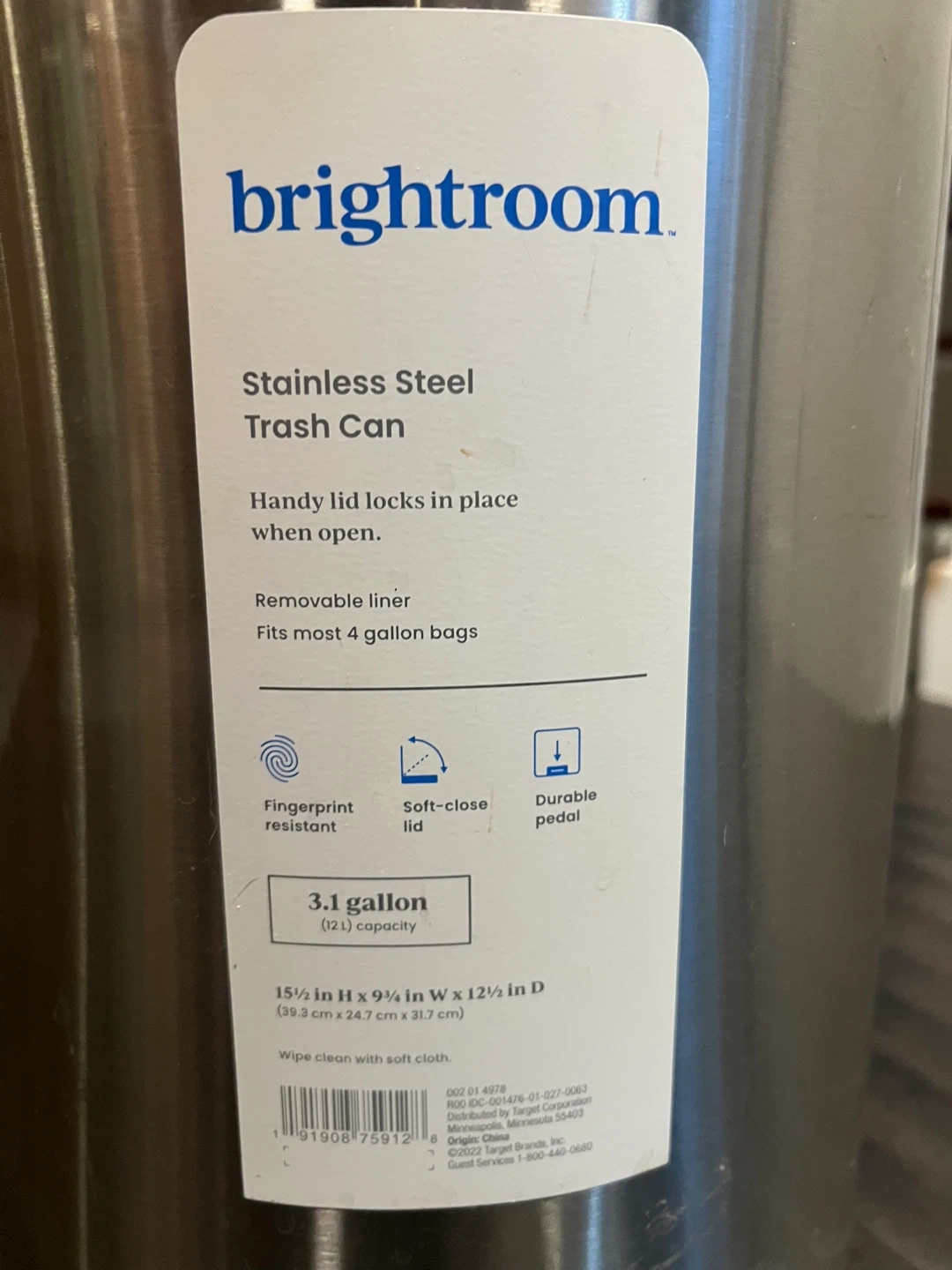 This is a 3.1-gallon stainless steel trash can by Brightroom. It features fingerprint-resistant material, a soft-close lid, removable liner, and a durable pedal. Fits most 4-gallon bags.