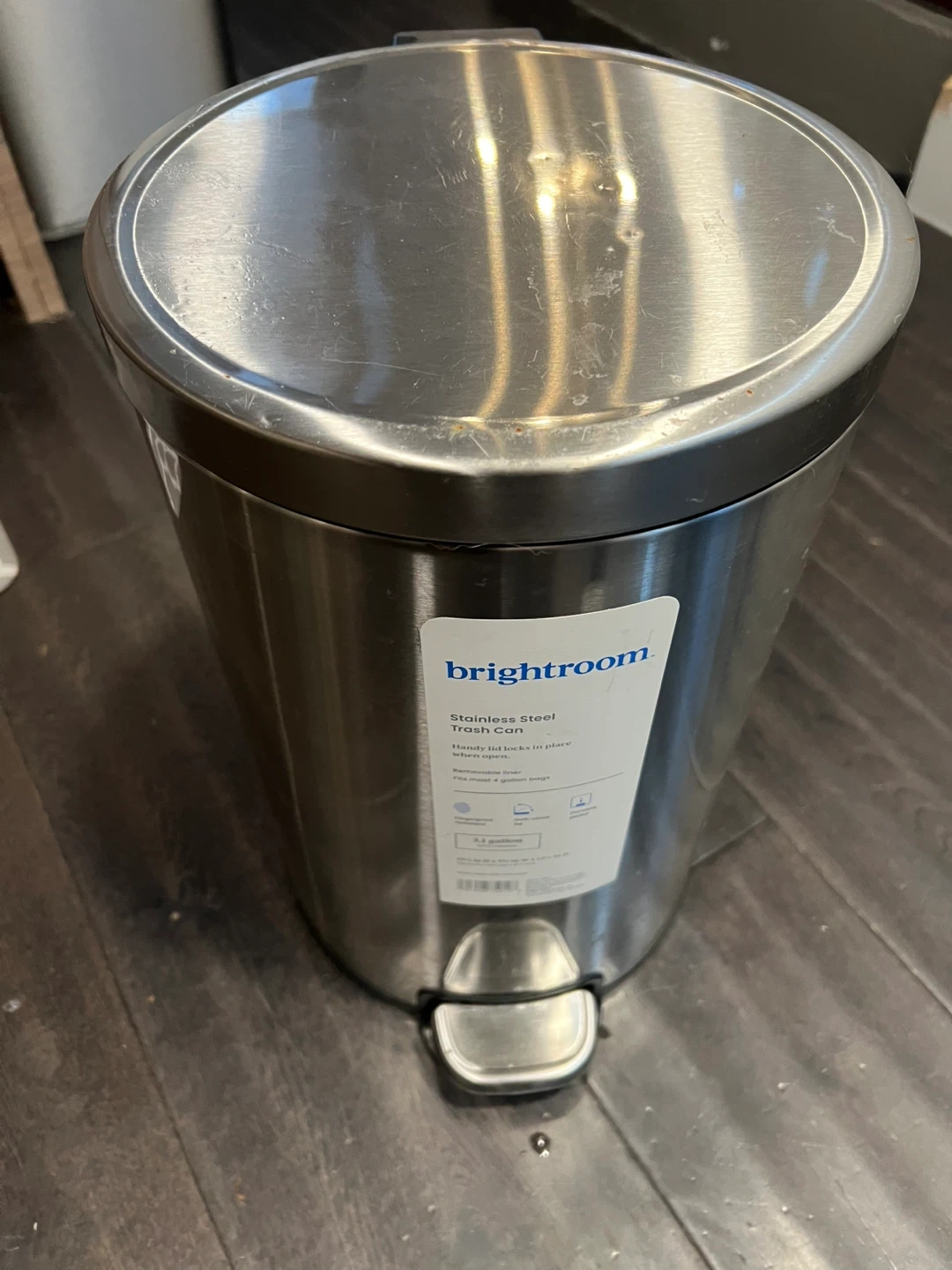 This is a 3.1-gallon stainless steel trash can by Brightroom. It features fingerprint-resistant material, a soft-close lid, removable liner, and a durable pedal. Fits most 4-gallon bags.