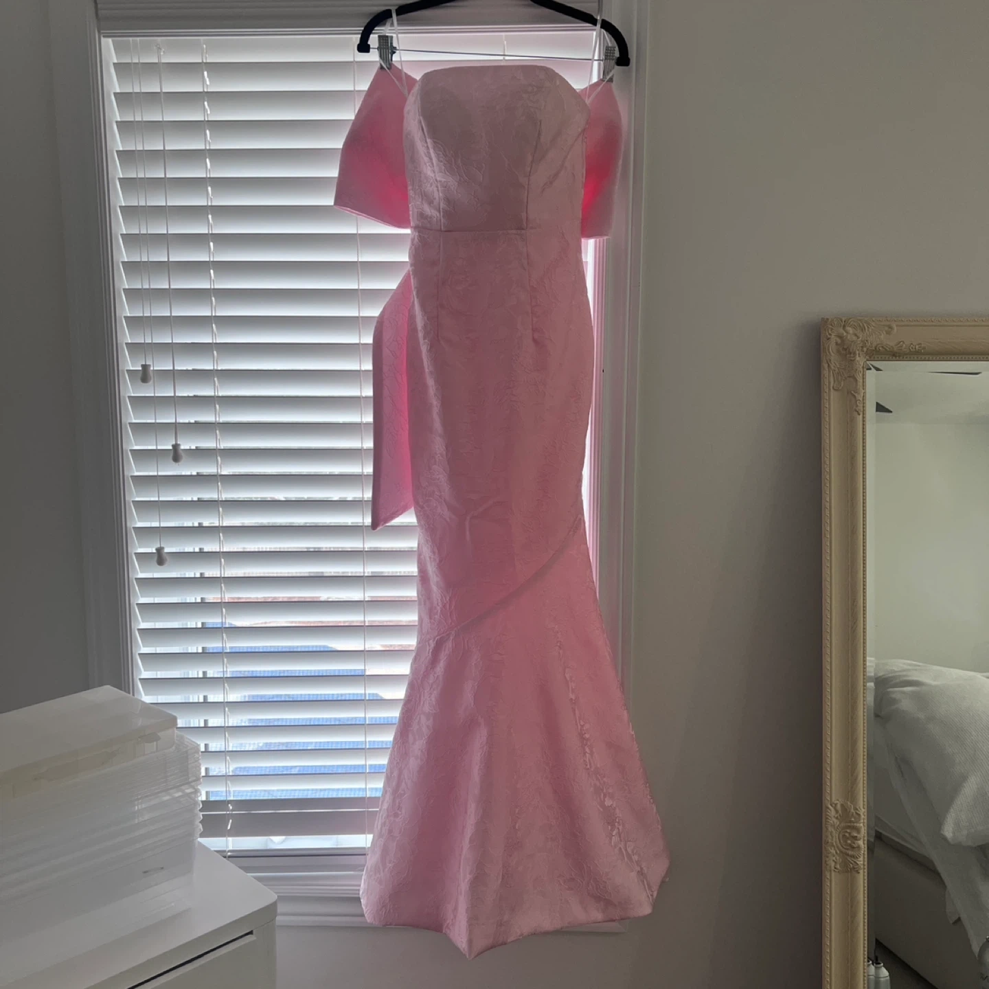 This is a beautiful pink gown with a textured brocade fabric. It features a flattering mermaid silhouette and a striking bow that can be worn on back or not . It's perfect for formal events!