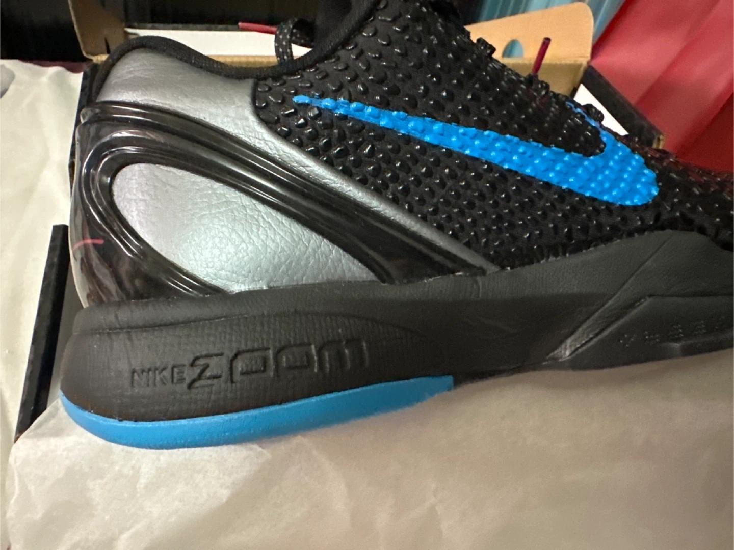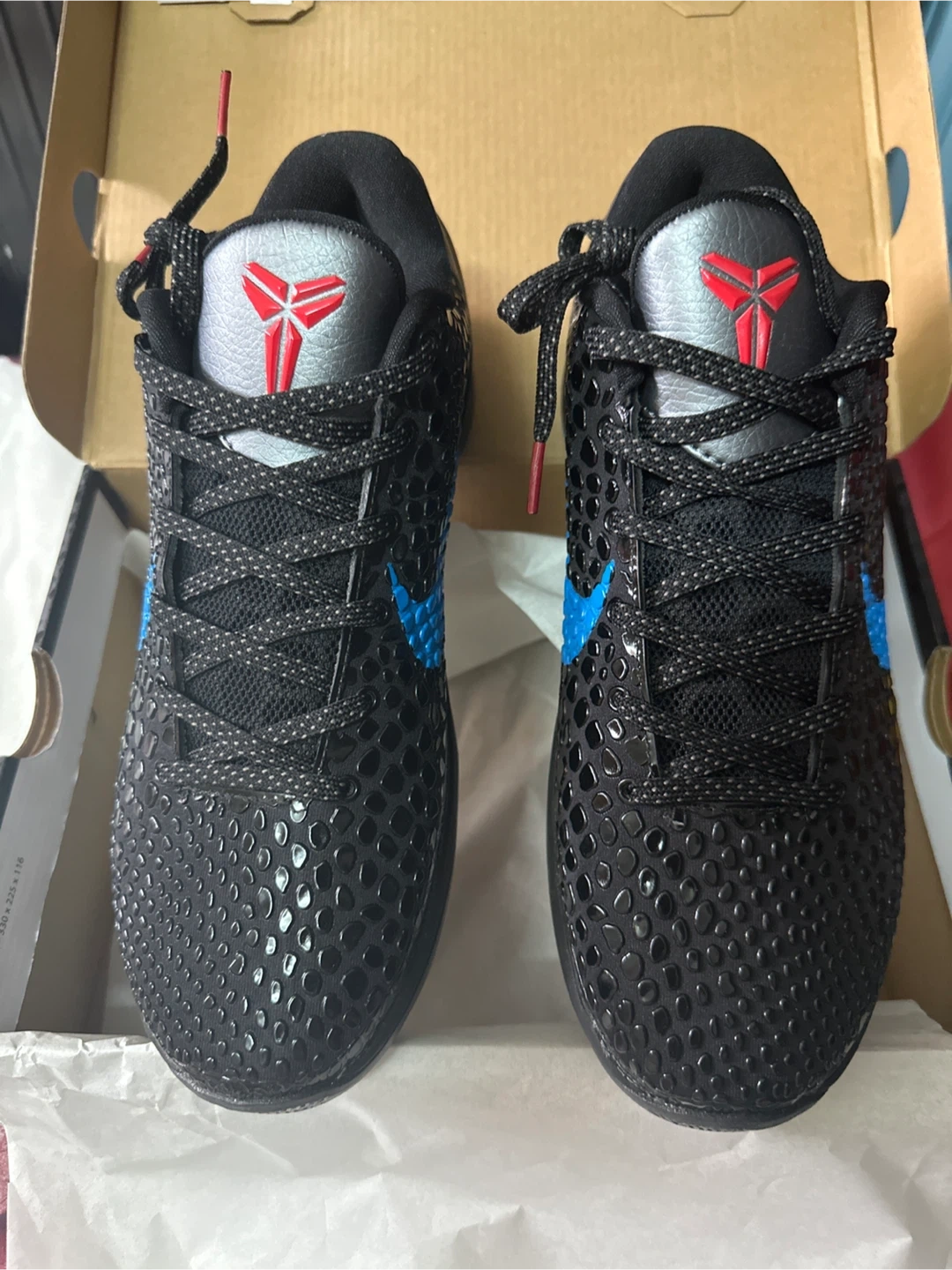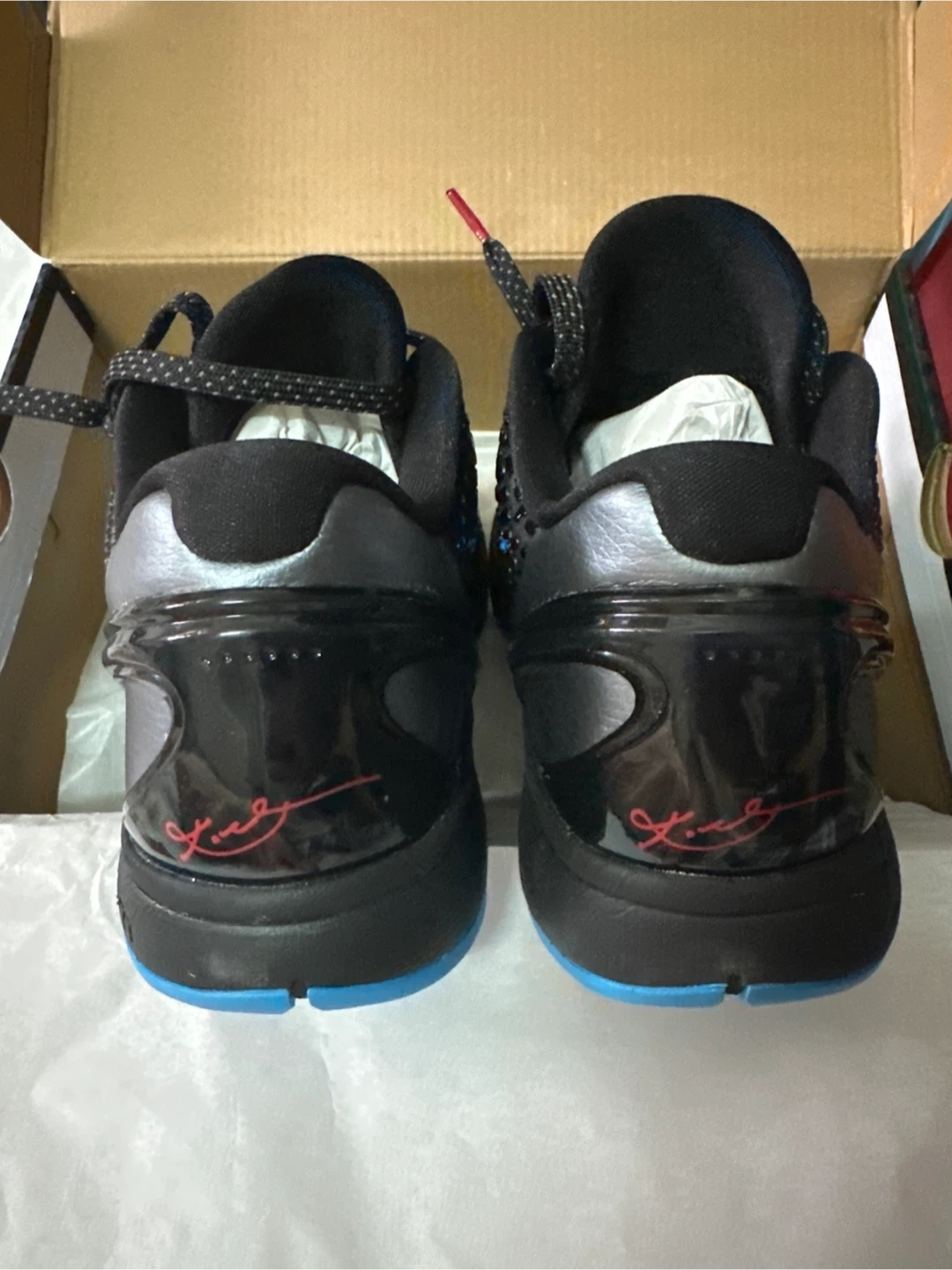 These are Nike Kobe 11 Elite basketball shoes in a Brave Blue colorway. They feature a knit upper and a carbon fiber shank for support. The shoes come with their original box. They're designed for performance on the court!