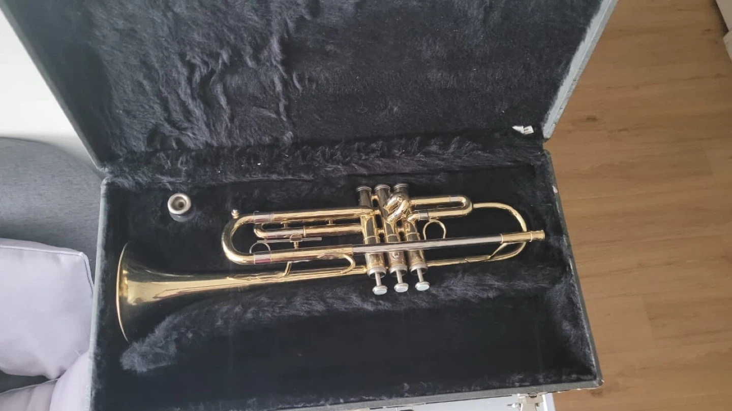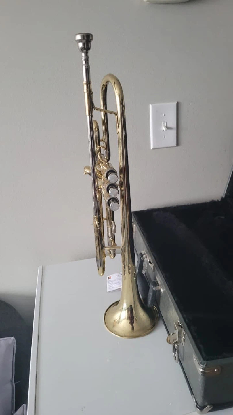 Gold-tone Yamaha trumpet with three valves. Includes a black hardshell case with a velvet interior. This instrument is ready for practice or performance.