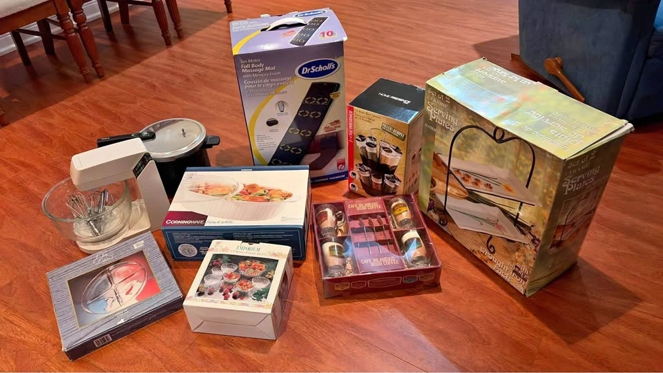 Diverse collection of home goods includes Dr. Scholl's full body massage mat with memory foam. Set has CorningWare French White bakeware and Home Presence 16 bottle spice carousel. Bundle includes ceramic serving plates with wrought iron rack, Irish coffee glass set, and 7 piece fruit set. Kitchen essentials like pressure cooker and stand mixer with glass bowl are also included. Items are primarily glass, ceramic, and metal.