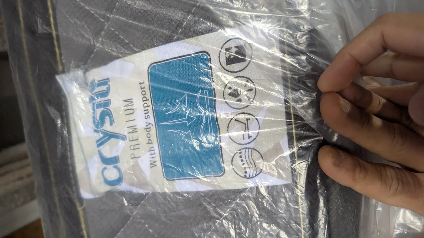 This is a Crystiu Premium mattress with body support. It's designed for comfort. Suitable for a bedroom.