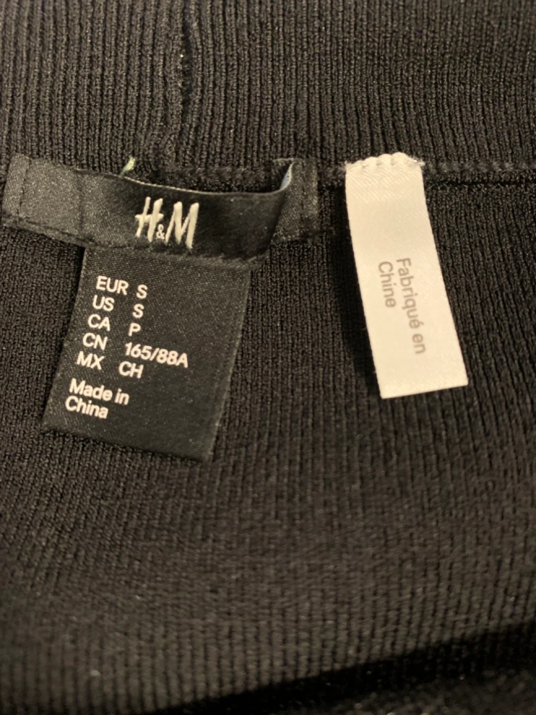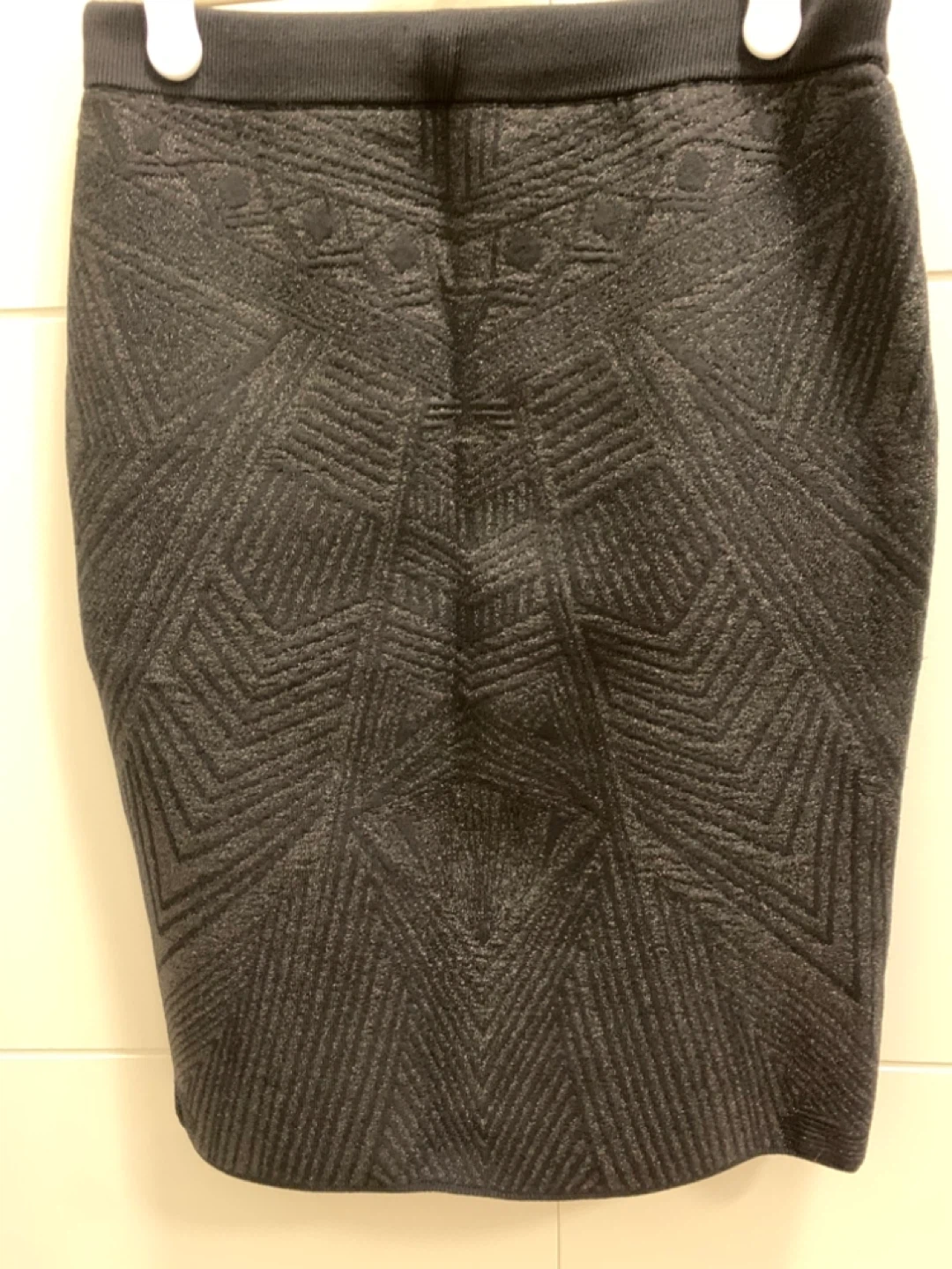 A black knit pencil skirt from H&M. It features a textured geometric pattern on the front and sides. The waistband is elasticized for comfort. Size is small.