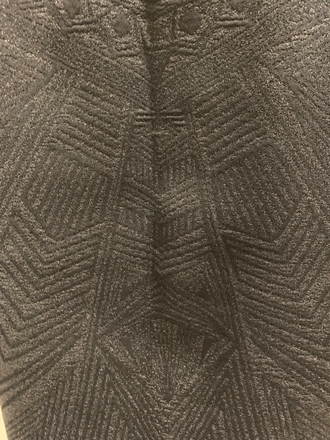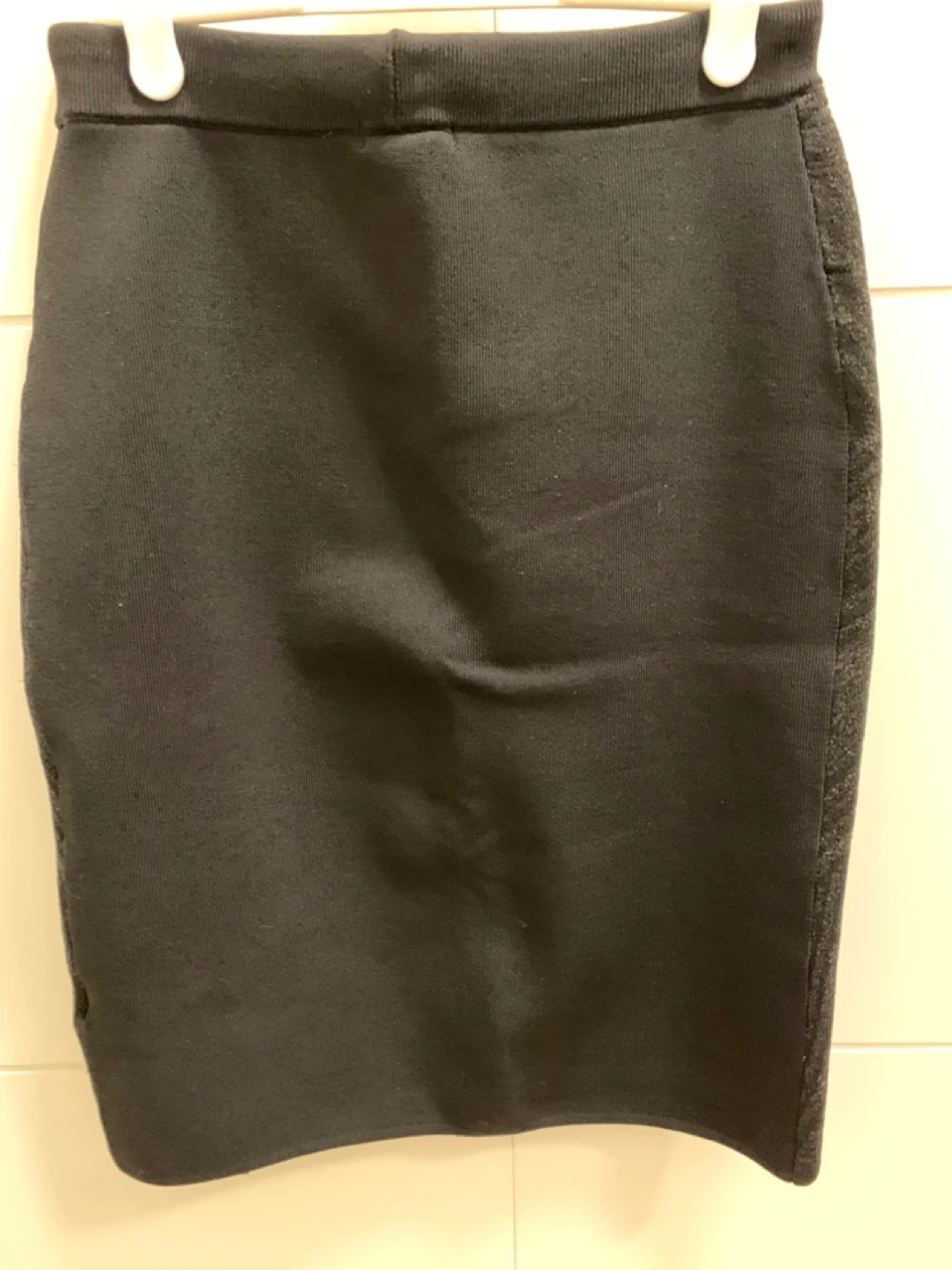 A black knit pencil skirt from H&M. It features a textured geometric pattern on the front and sides. The waistband is elasticized for comfort. Size is small.