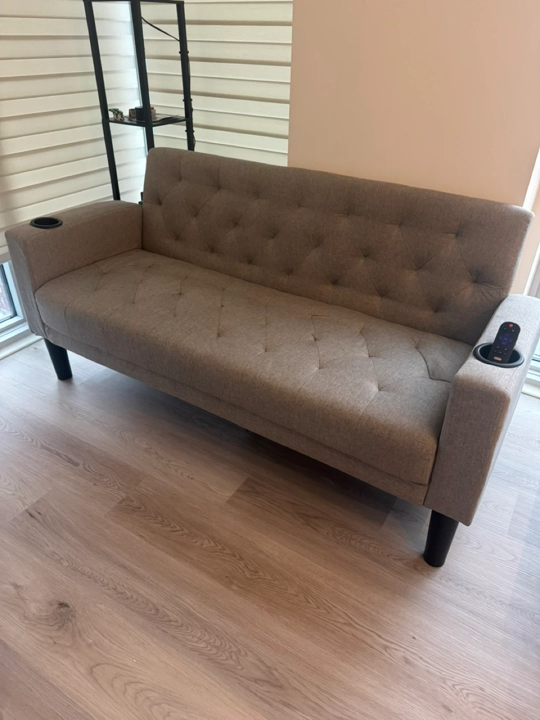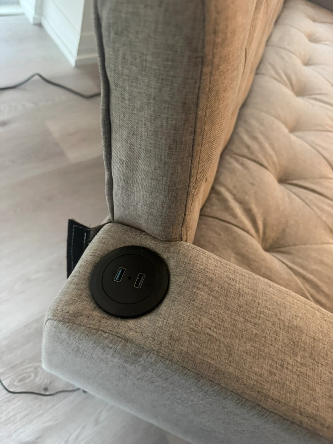 Tufted sofa upholstered in a light grey fabric. It features two built-in cup holders on the arms and a convenient USB charging station. Perfect for a living room or den!