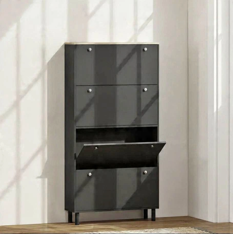 Sleek black shoe cabinet with a slim design, great for tight spaces. Comes with multiple tilt-out compartments for shoes. Also has an open shelf for extra storage or decor. Top has a cool wood-look finish. Silver knobs on doors.