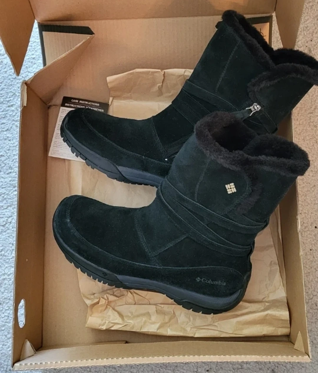 Unworn Columbia Sportswear Company winter boots in black with box. These waterproof boots feature faux fur lining and an omnigrip sole. Includes original box and care instructions. Size 10 (US Women's). They were just a little too big for me as I'm a size 9.5. Original price $140 plus tax.