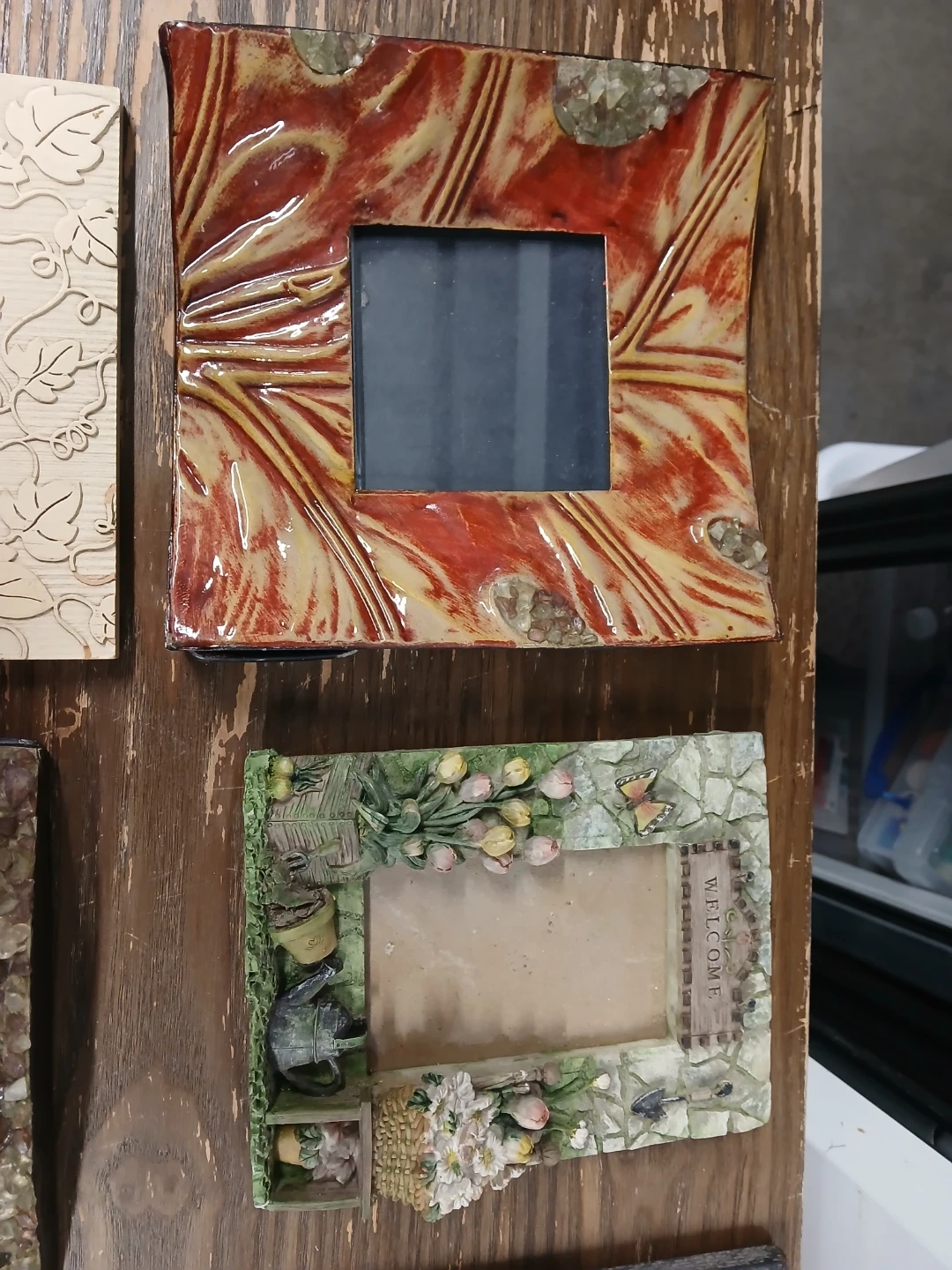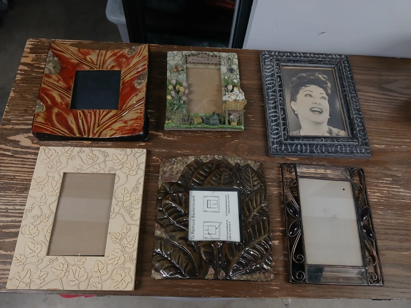 Bundle of six decorative photo frames in various styles and materials. Includes wooden, ceramic, and metal designs. Perfect for displaying your favorite memories!