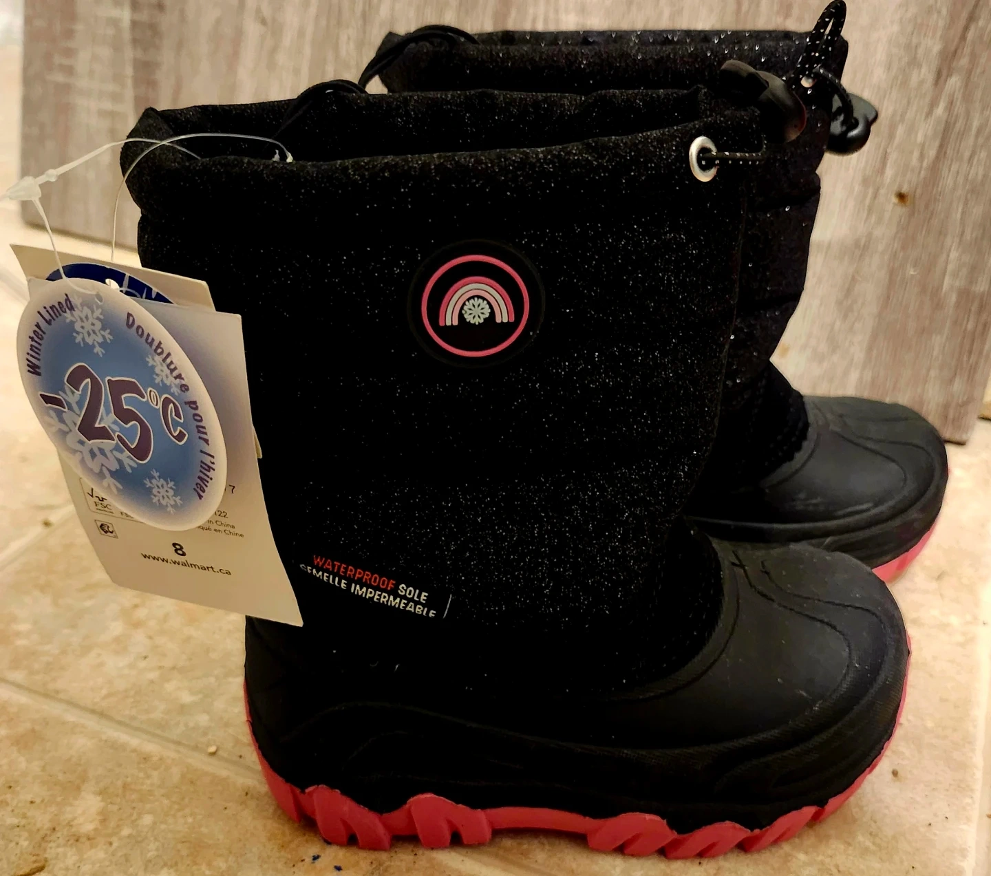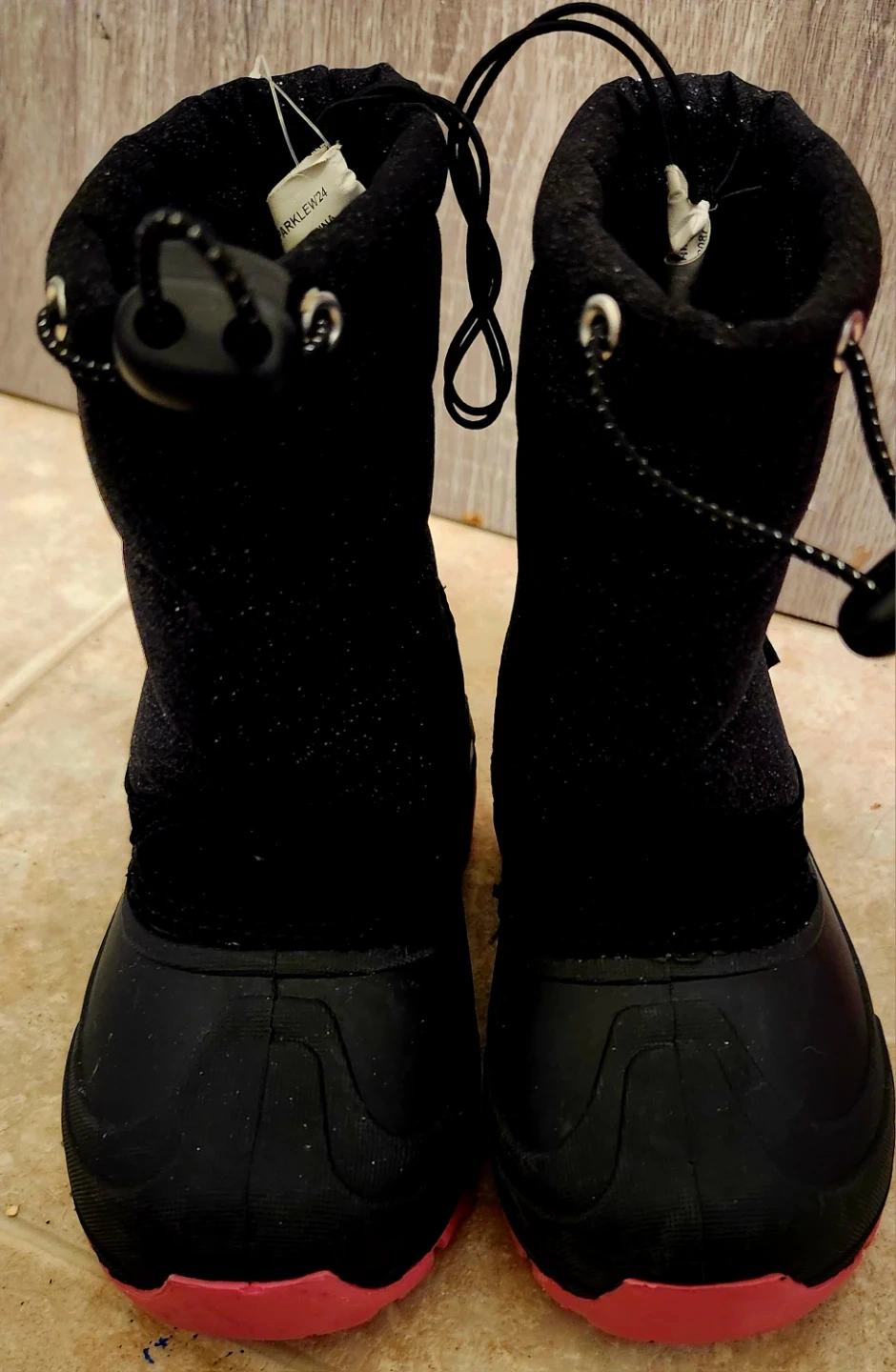 Black winter boots for kids in size 8. They're winter lined and waterproof with a rubber sole. Features a bungee cord closure for a snug fit.