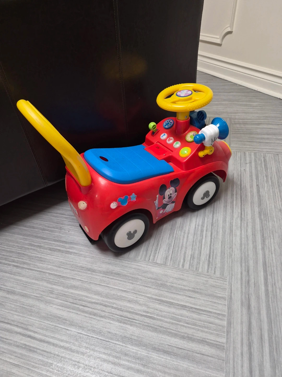 This red ride-on toy car features a blue seat and a yellow steering wheel. It has Mickey Mouse decals and a horn. A yellow push handle is attached to the back. It's suitable for young children to push or ride on.