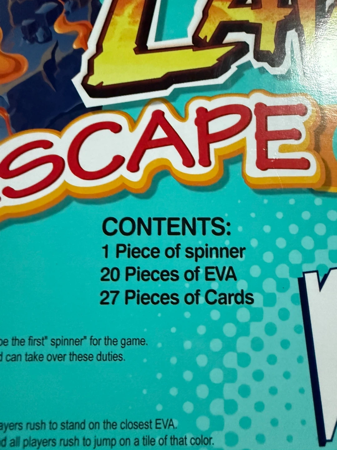 This is the Lava Escape Game, a fun physical lava leaping game. It includes 1 piece of spinner, 20 pieces of EVA, and 27 pieces of cards. Players must avoid touching the floor. It's a great game for families!