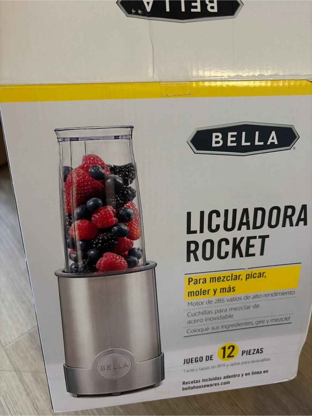 This is a BELLA Rocket Blender 12-piece set. It includes cups and lids that are dishwasher safe. The blender is designed for mixing, chopping, and grinding.