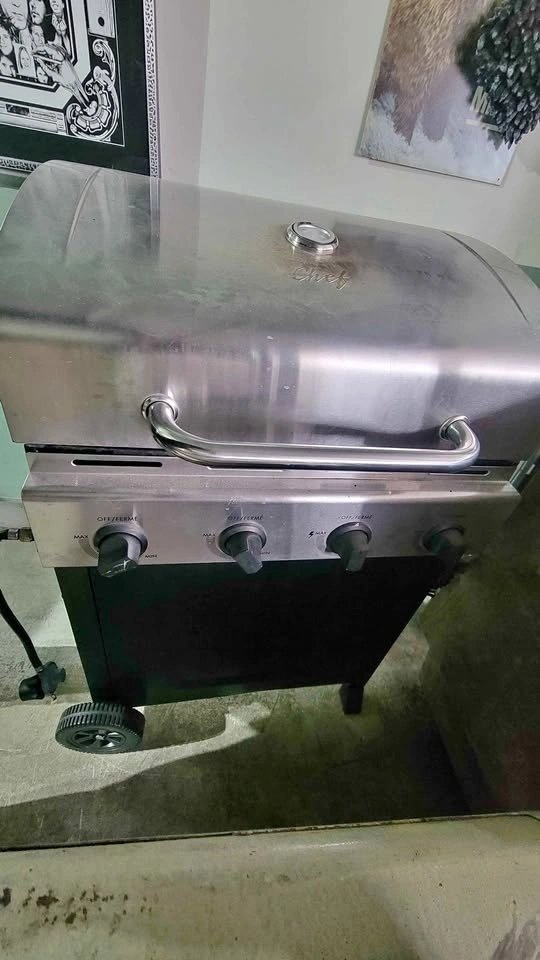 Used Master Chef BBQ with one propane tank. All the pieces are there; you just need to re-attach the side tables and put the grates back on. I can even help you reassemble it. It's very easy to put back together, taking only 6 screws. The BBQ works perfectly with nice, even heat and can be used immediately. Just fill the tank or exchange it. You might want to replace the heat shield eventually (around $15), but it's not critical right now. It cooks a mean steak! Please give this BBQ a new home. Pickup is available anytime in the Langley Township area near Home Depot. Easy pickup from my garage, and I can help you load it.
