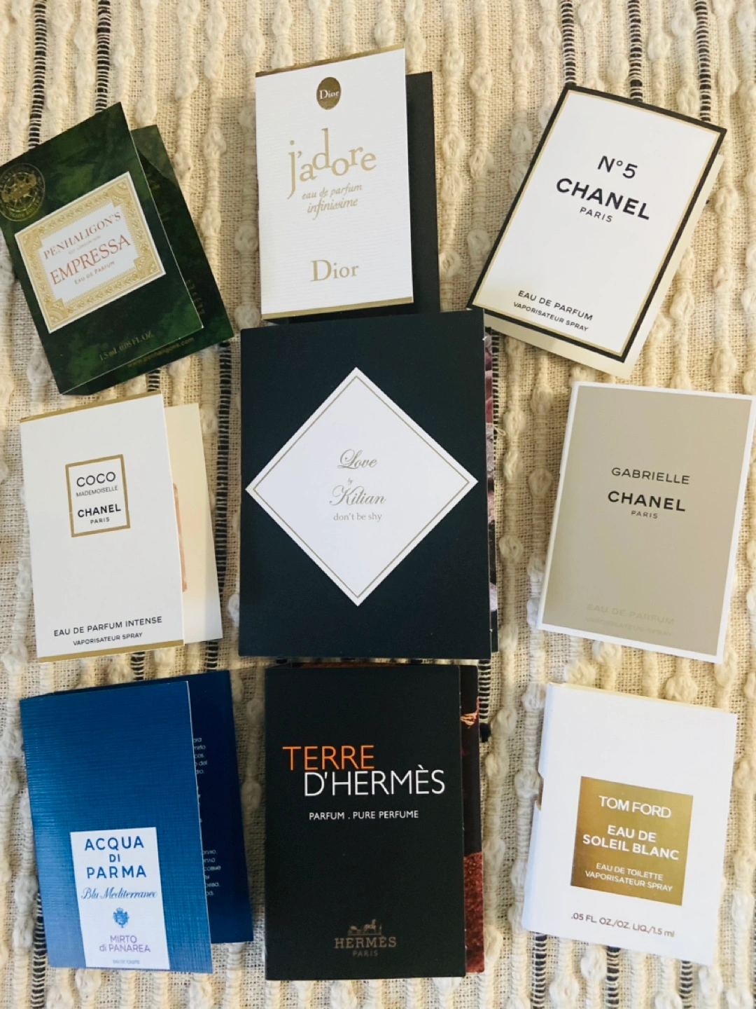 BEST PRICE IN TOWN.Collection of Luxury perfume samples Includes Chanel No. 5, Coco Mademoiselle, Gabrielle, Tom Ford Soleil Blanc, Dior J'adore, Kilian Love Don't Be Shy, Acqua di Parma, and Terre d'Hermès. 1.5 ML each. Great for testing or adding to your collection. DOWNTOWN PICK UP ONLY 👍