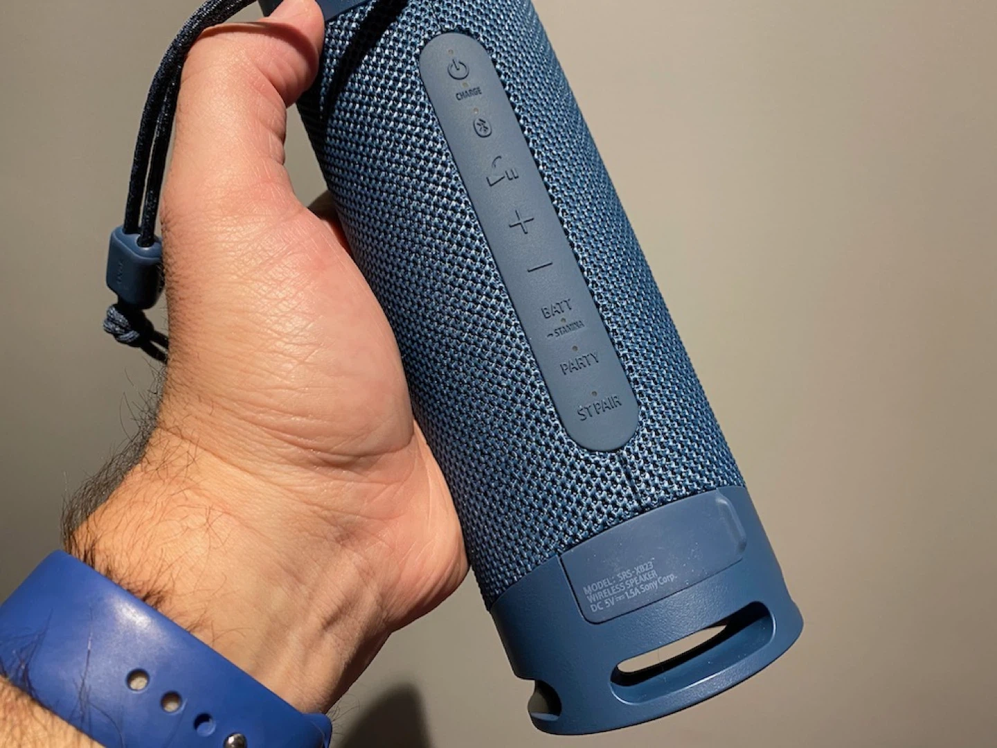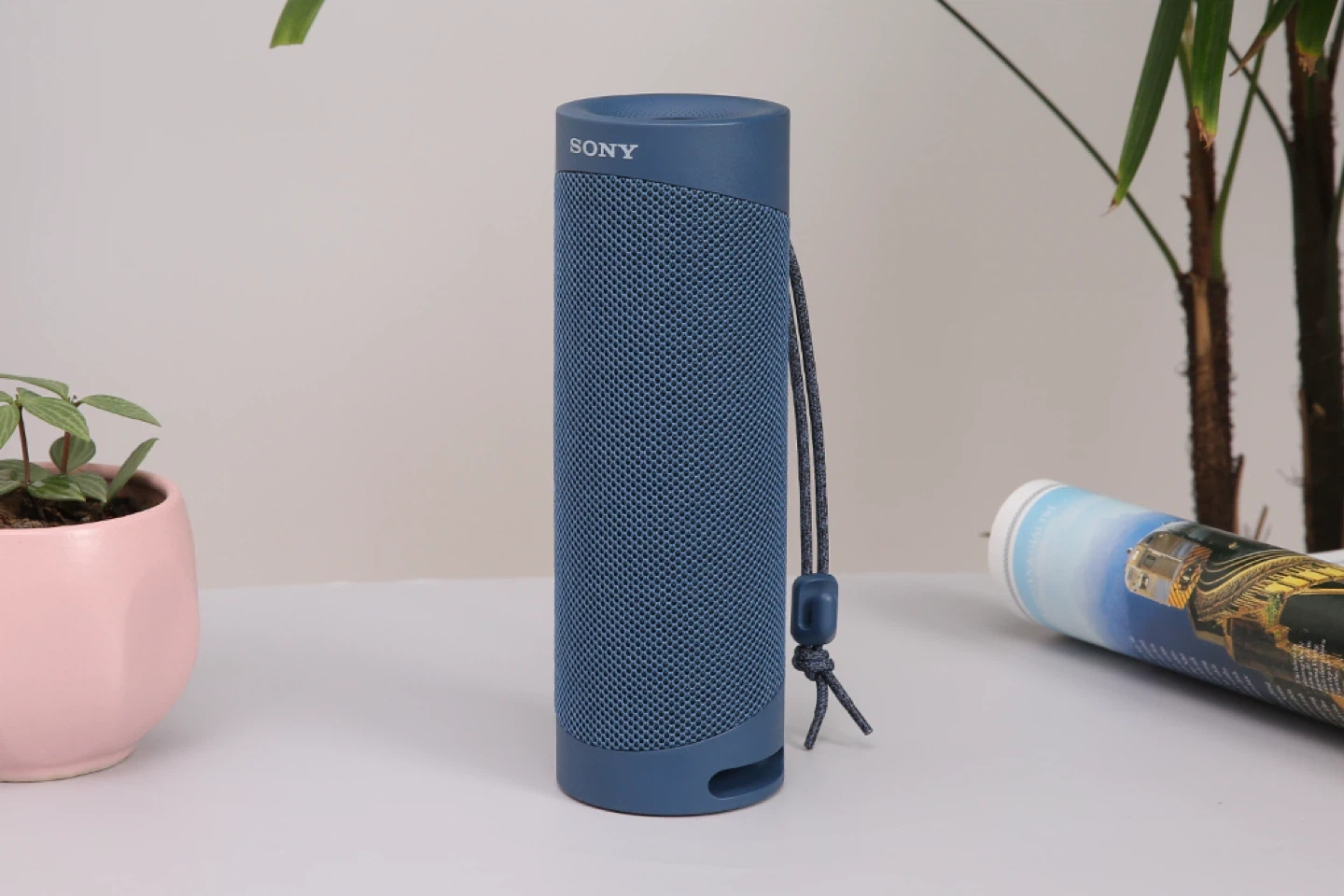 This is a blue Sony SRS-XB23 portable wireless speaker. It's water-resistant and dustproof with a long battery life. It's great for outdoor use or parties!