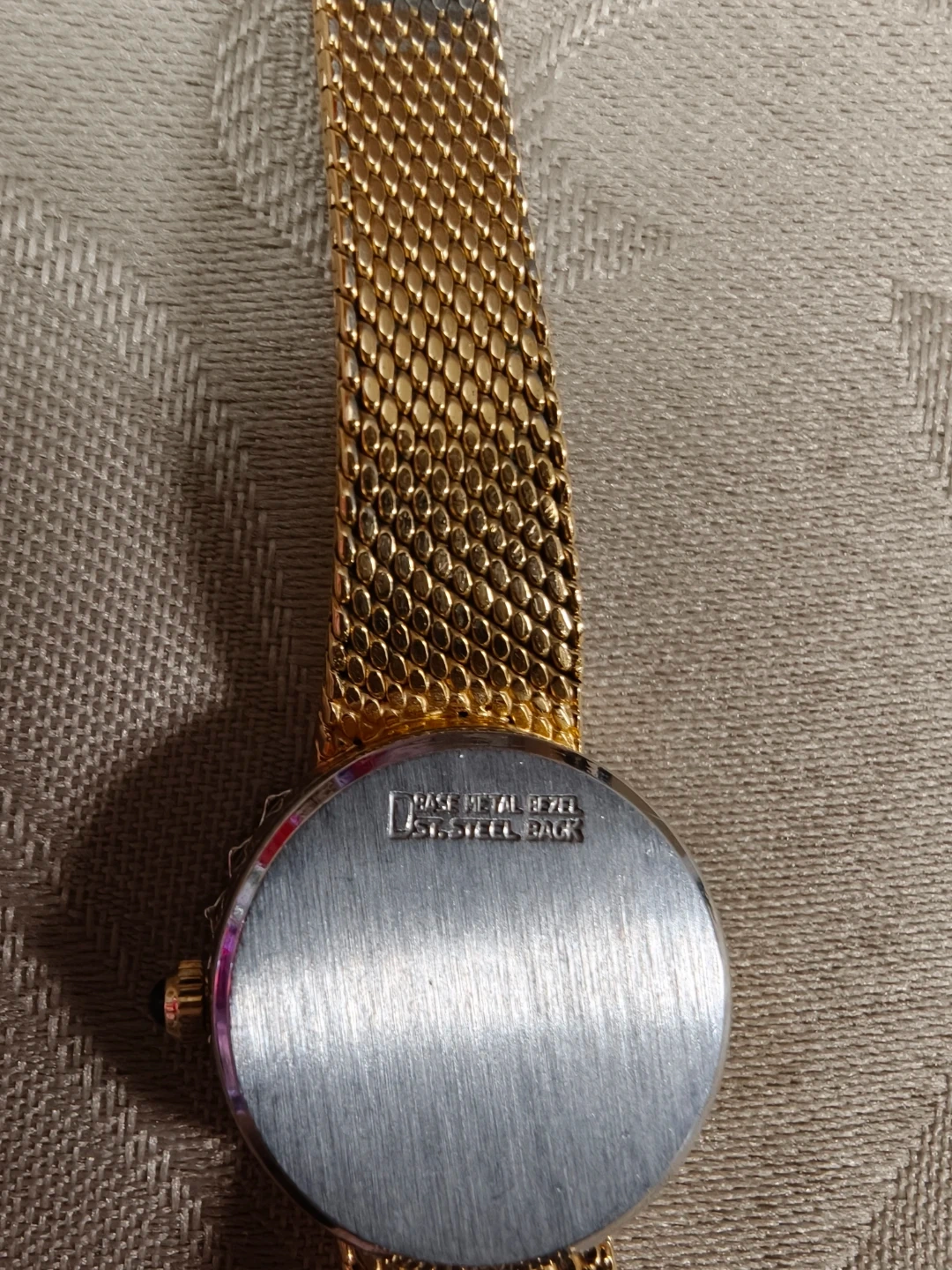 An exquisite "hallo setting .Integrated gold-tone mesh strap with a refined "bark" texture that catches the light beautifully.