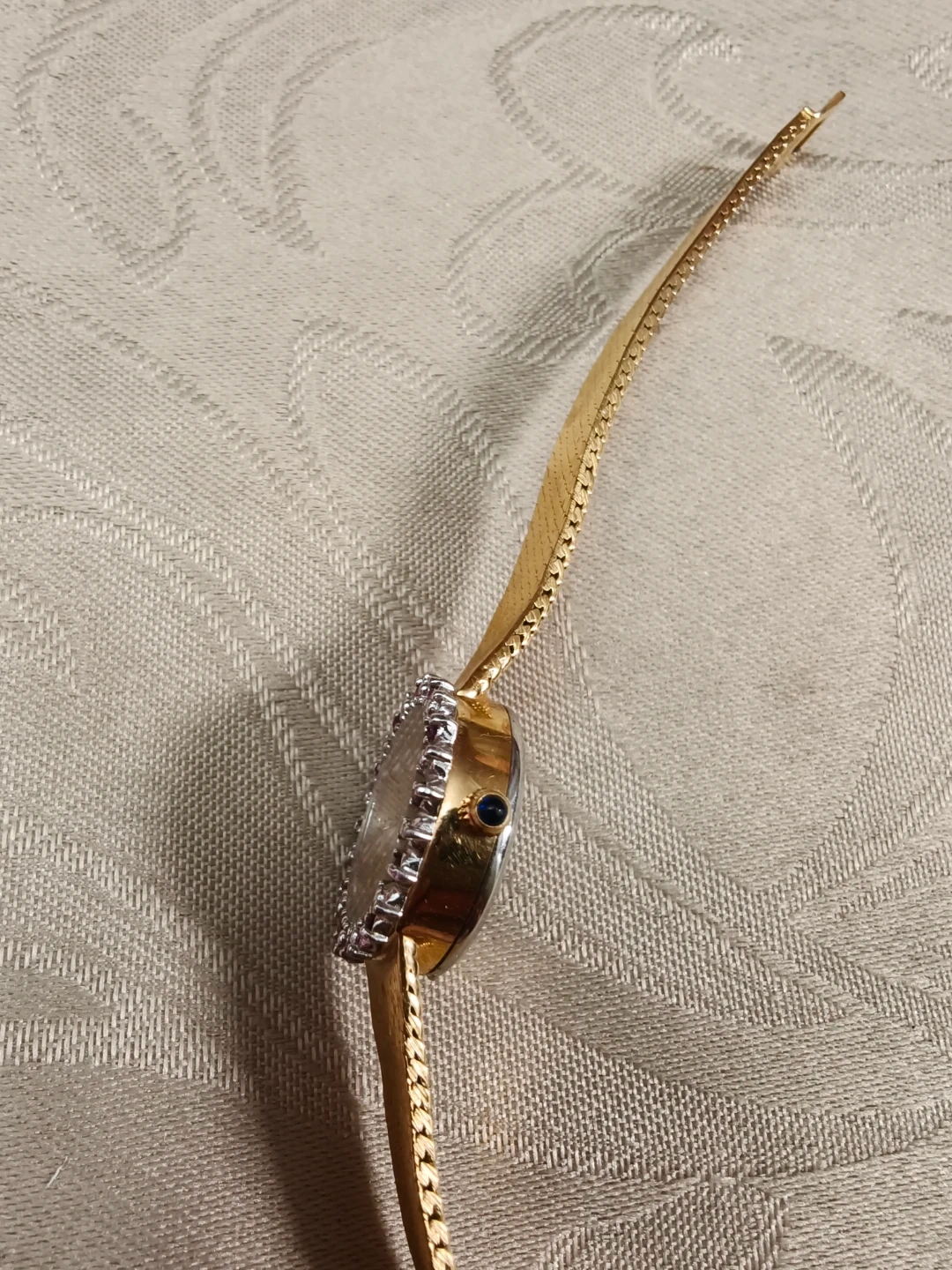 An exquisite "hallo setting .Integrated gold-tone mesh strap with a refined "bark" texture that catches the light beautifully.