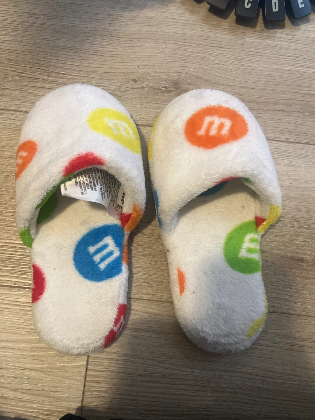 Cozy white plush slippers featuring M&M's character logos. Made with 100% polyethylene and polyester fibres. Perfect for lounging around the house!