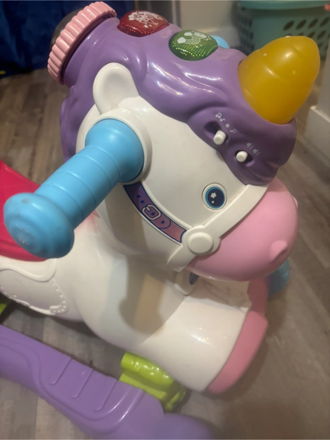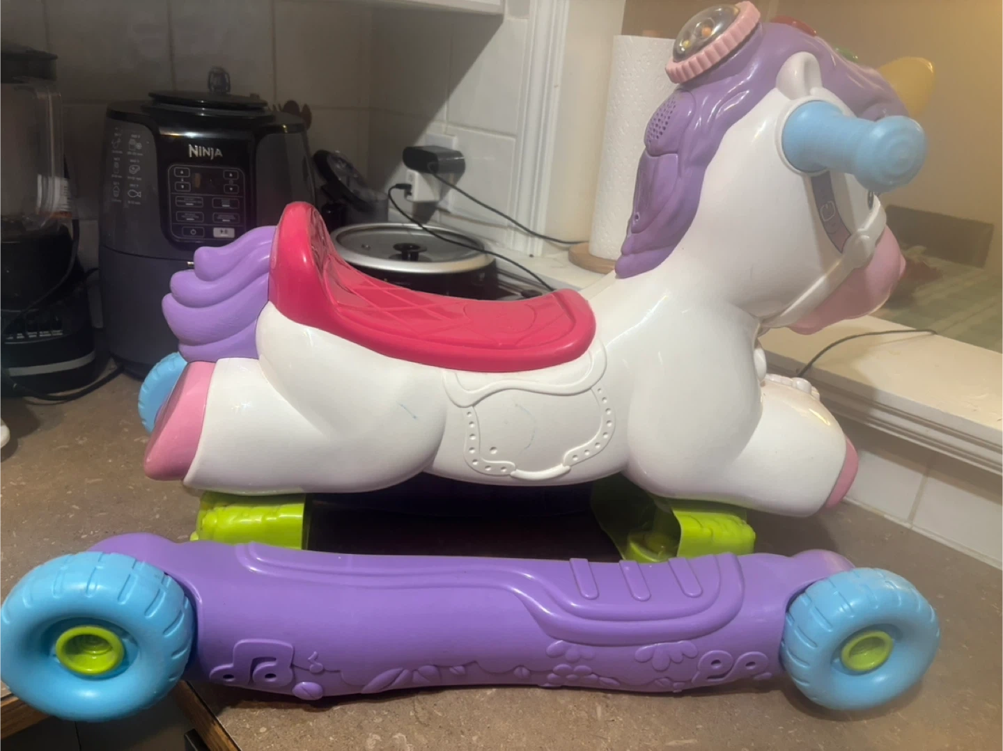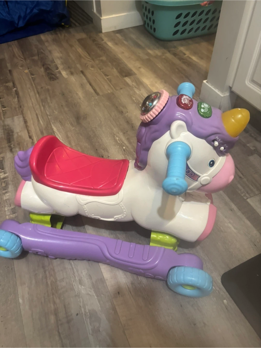 This VTech ride-on unicorn walker is perfect for little ones learning to walk! It plays music and sounds, featuring lights and interactive buttons on its head. It converts from a floor toy to a ride-on, with a sturdy seat and handlebars for support. A fun way for toddlers to explore and develop motor skills!