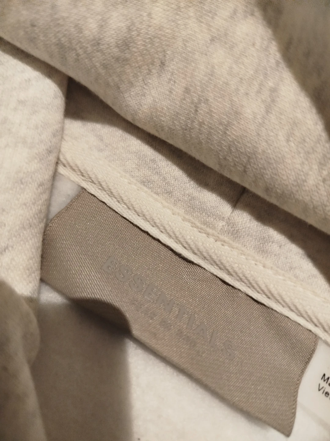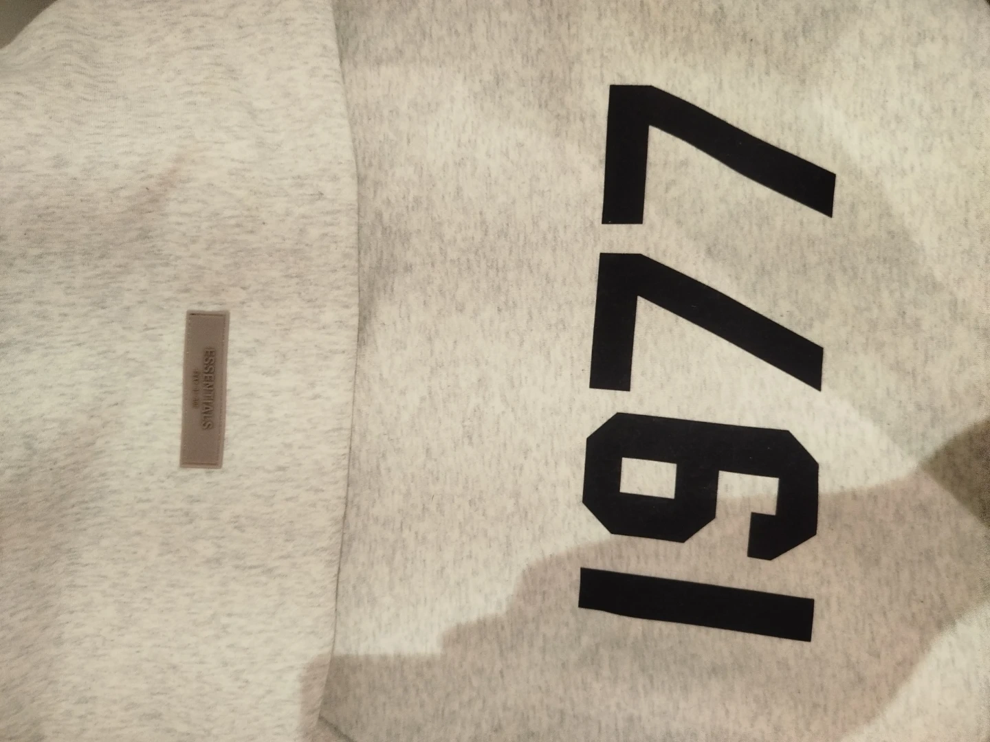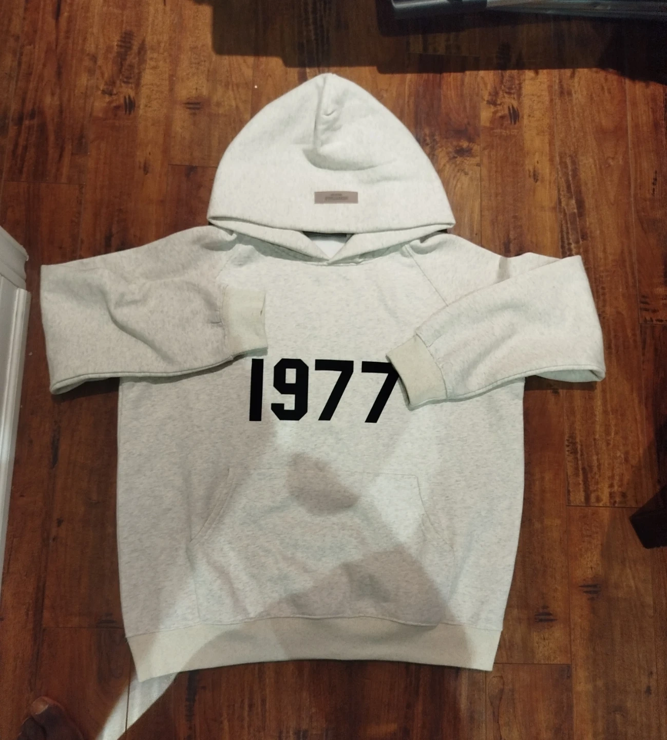 Light grey heathered hoodie with "1977" graphic print on front. Includes a small rubberized Essentials logo patch on the chest. Made from a comfortable blend, perfect for casual wear.