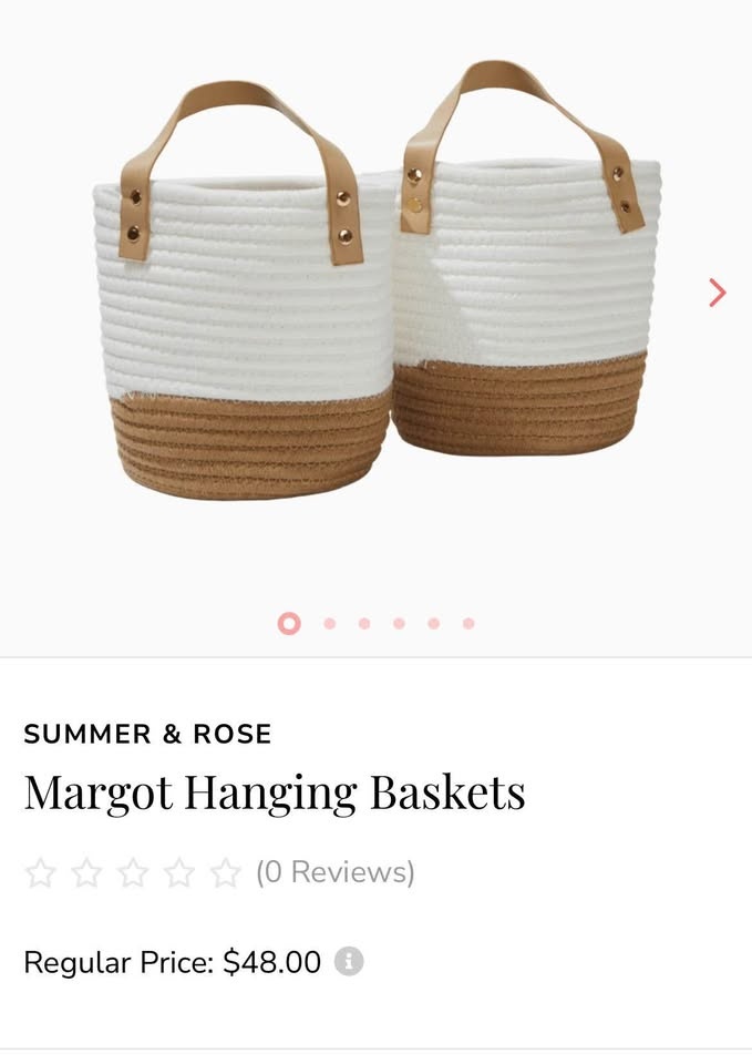 Buy & SellSuper cute Margot Summer and Rose hanging basketsSuper cute Margot Summer and Rose hanging baskets$40Brand new hanging baskets by Summer and Rose. Two sets of two baskets available. $40 for the set. $75 for all 4.WHERE TO MEETCheck LocationView MapSELLERAlyssaPenticton250 reviews0 chats·0 favorites·7 viewsSEND CHAT TO SELLERHi Alyssa! I’m interested in your listing.Hi Alyssa! I’m interested in your listing.Get the Karrot app to chatSign In to chat