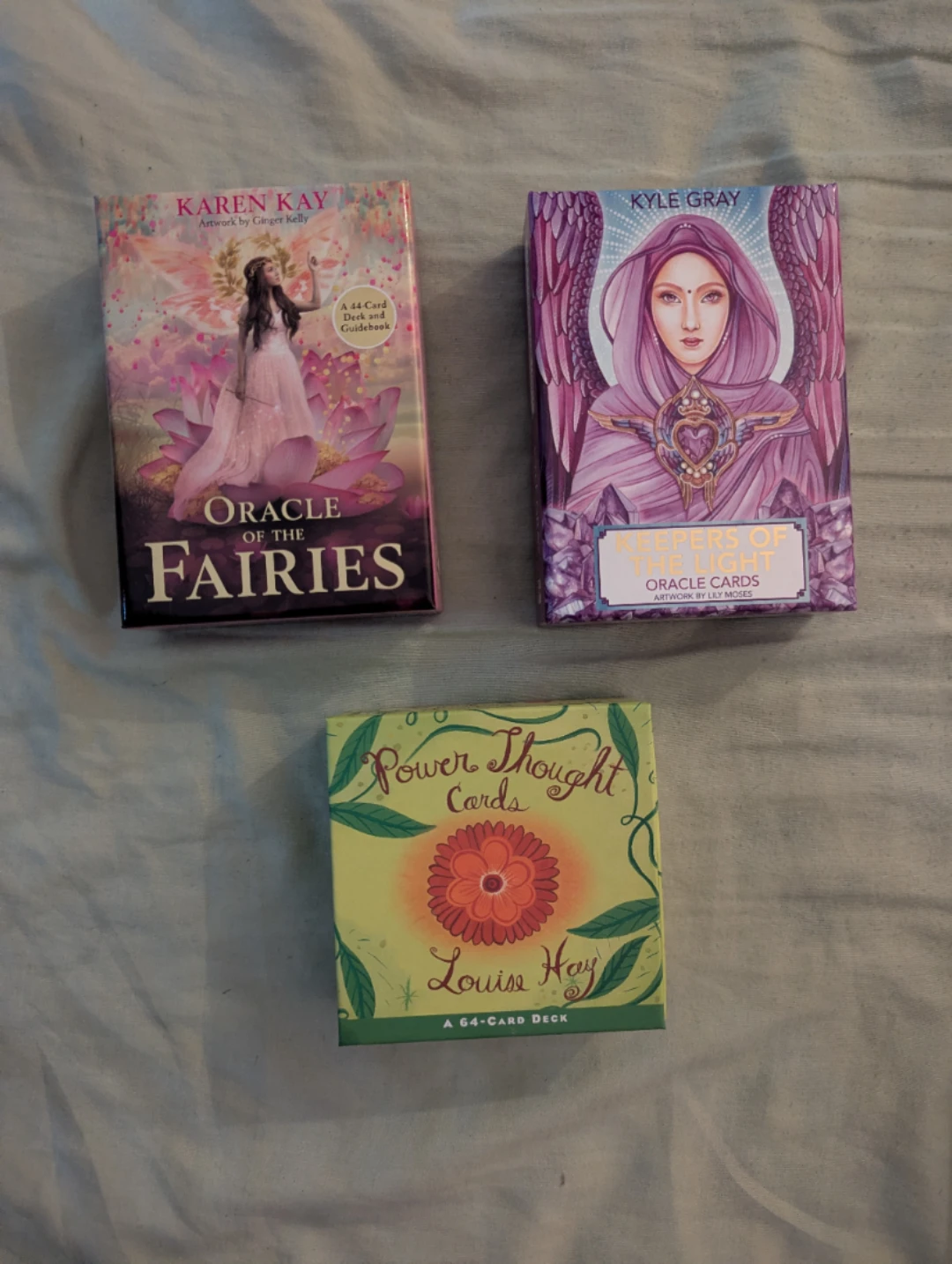 Selling a set of three oracle card decks: Oracle of the Fairies by Karen Kay, Keepers of the Light Oracle Cards by Kyle Gray, and Power Thought Cards by Louise Hay