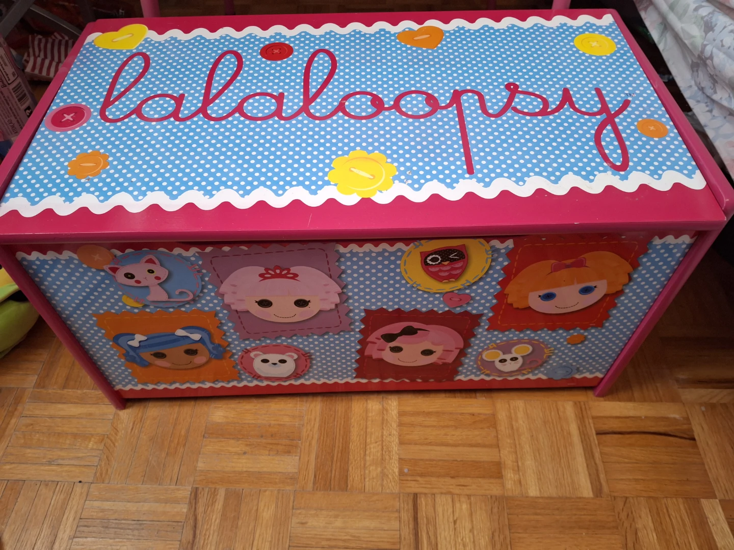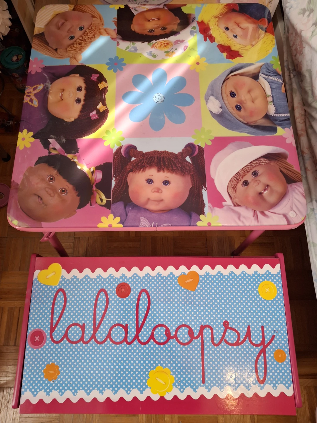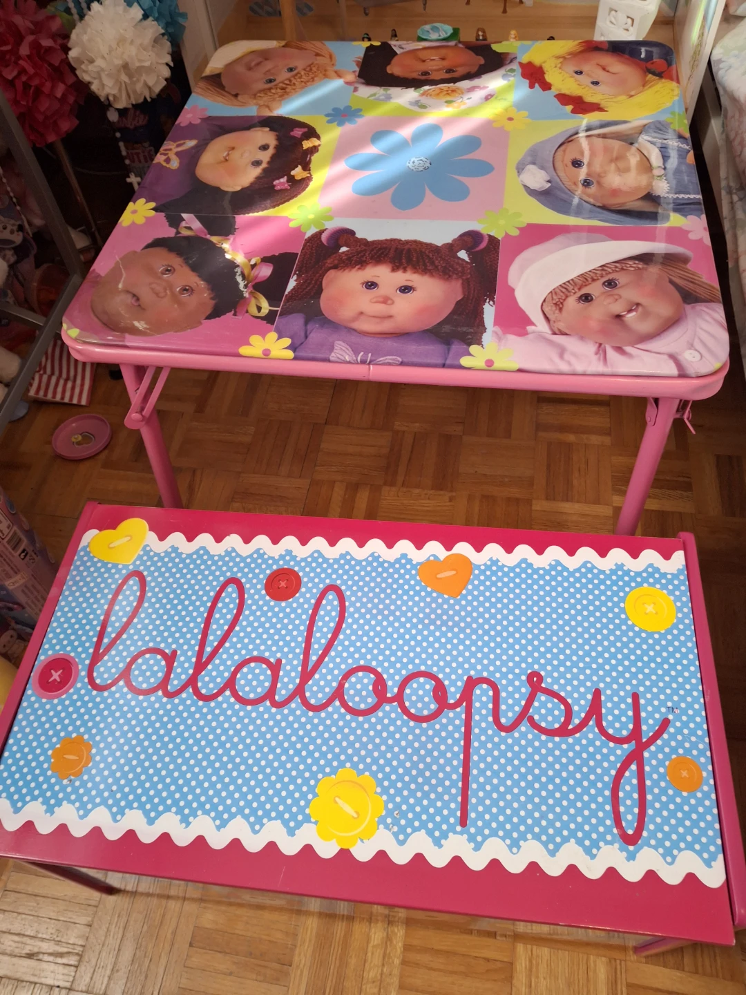 Selling a Lalaloopsy toy box and table set! The toy box is pink and decorated with Lalaloopsy characters. The table has a Cabbage Patch Kids design on top. Great for a playroom or kids' room!