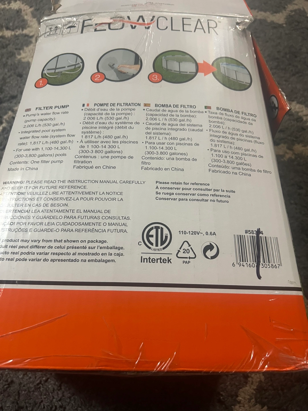 Selling a brand new Flowclear filter pump, still in its original packaging! It's designed for pools ranging from 1,100 to 14,300 L (300 to 3,800 gallons). This filter pump provides a water flow rate of 2,006 L/h (530 gal/h) and an integrated pool system flow rate of 1,817 L/h (480 gal/h). It uses one filter cartridge and is easy to install and maintain