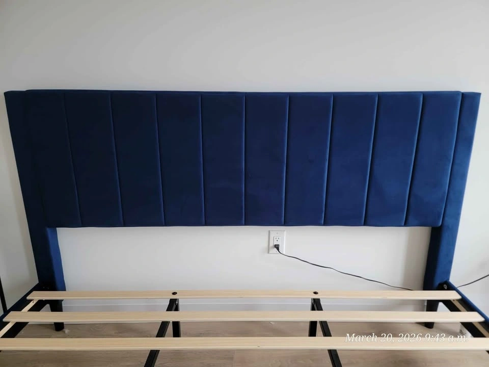 Blue velvet bed frame with tufted headboard. This King-sized bed features a sturdy design and elegant upholstery. Smoke-free home. Located in the Rossland and Brock St area of Whitby. Mattress not included. Used for staging.