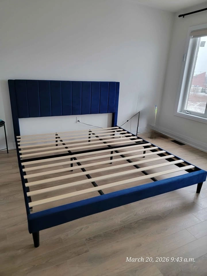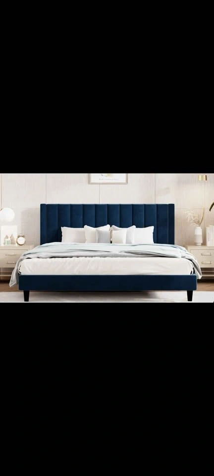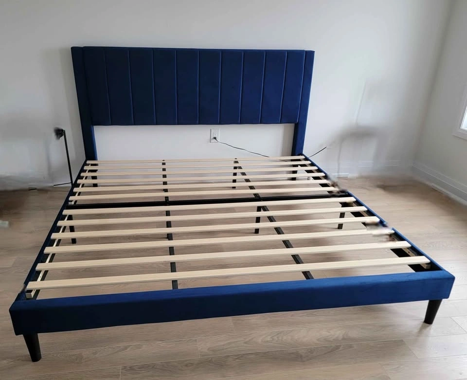 Blue velvet bed frame with tufted headboard. This King-sized bed features a sturdy design and elegant upholstery. Smoke-free home. Located in the Rossland and Brock St area of Whitby. Mattress not included. Used for staging.