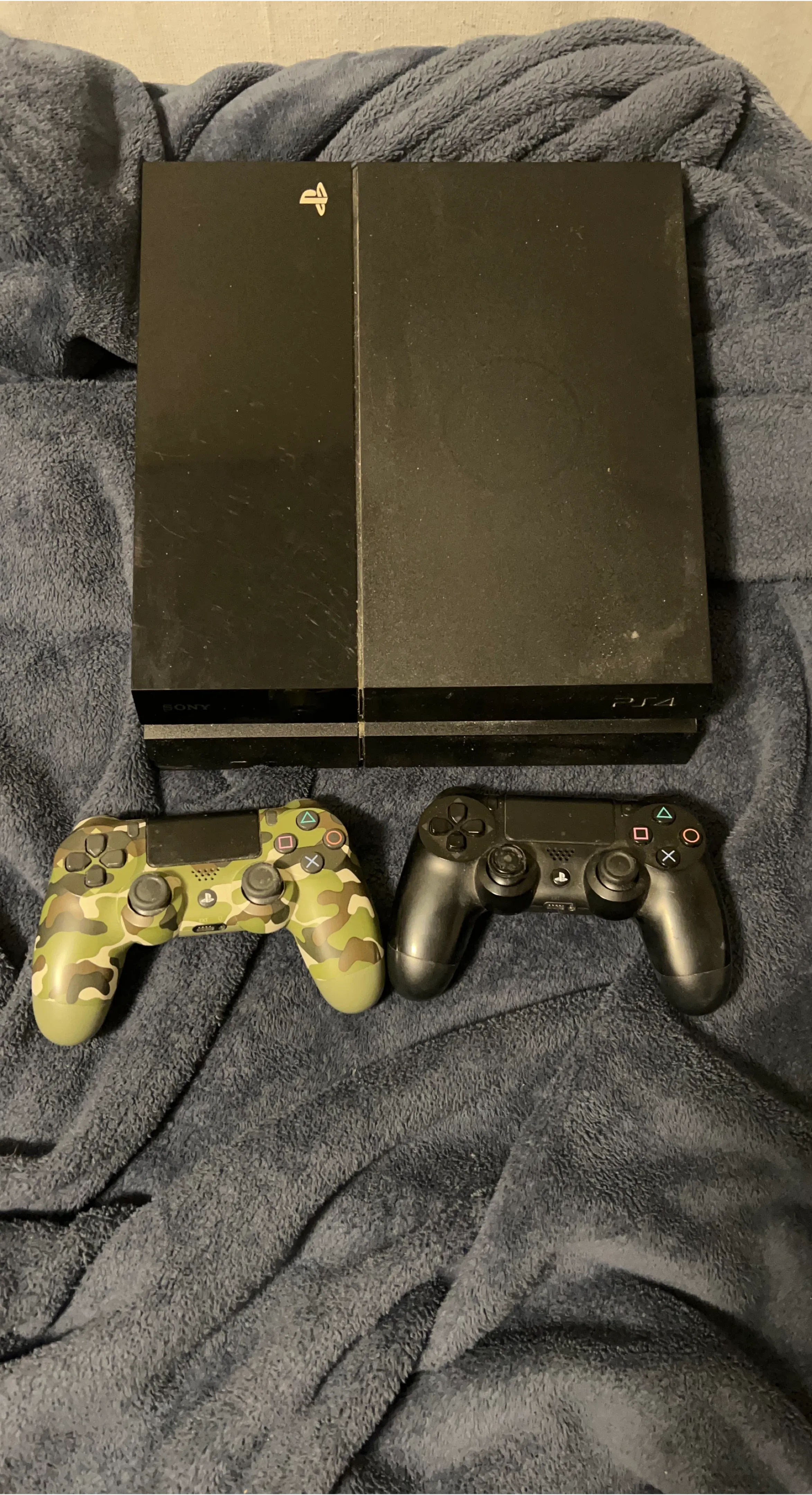 Black Sony PlayStation 4 console. It comes with two DualShock 4 controllers, one in black and one in a camouflage pattern. Great for gaming nights! the camo controller usually goes around 90 on amazon but i need some things gone so ill do 150 for it all or if you dont need the console or controllers lmk if you only want to buy one thing