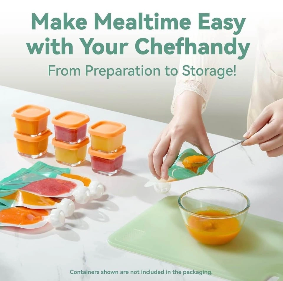 The Chefhandy Baby Food Maker is a versatile, 5-in-1 device that can steam, cook, puree, and reheat. It comes with a stainless steel steam basket and 6 reusable pouches. It is BPA-free and comes in green.