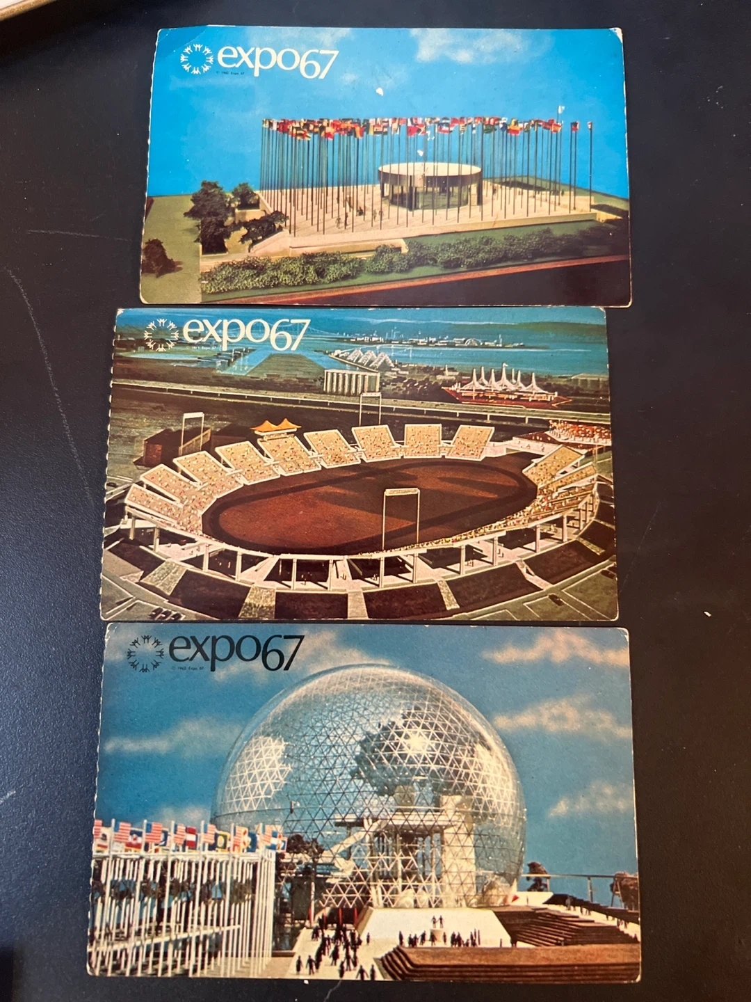 Commemorative tin tray 11” x 8 from Expo 67 featuring "The Pavilion of Canada" Includes 3 original Expo 67 postcards. And three Black and white actual photos . A nice piece of Canadian history!