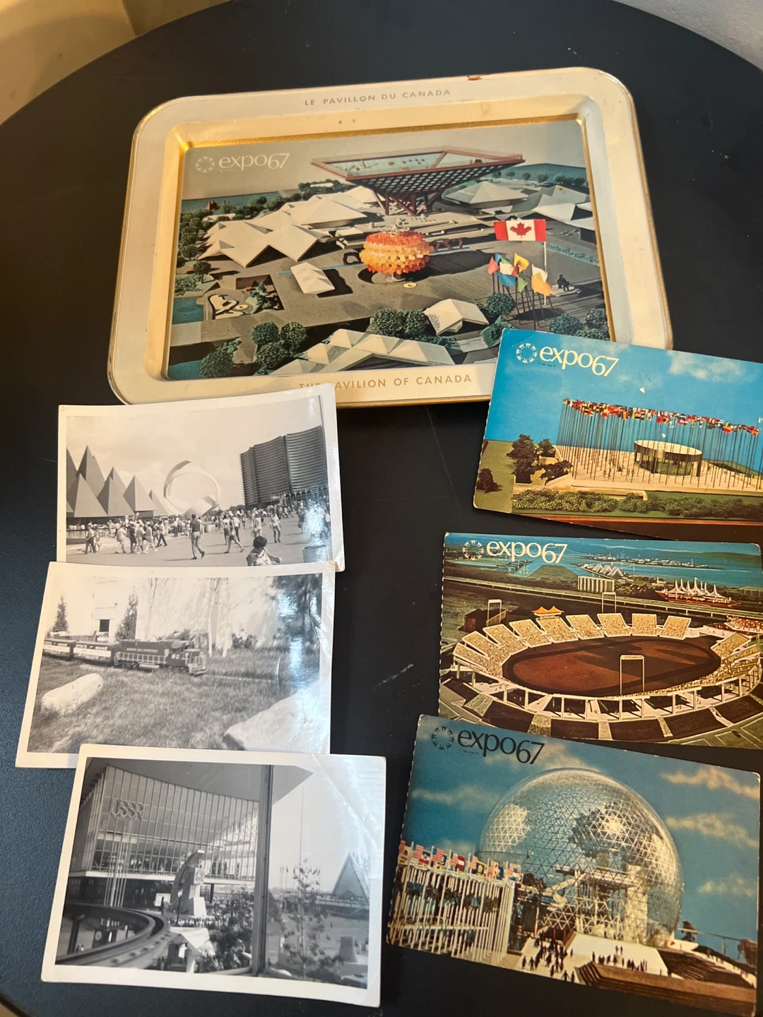 Commemorative tin tray 11” x 8 from Expo 67 featuring "The Pavilion of Canada" Includes 3 original Expo 67 postcards. And three Black and white actual photos . A nice piece of Canadian history!
