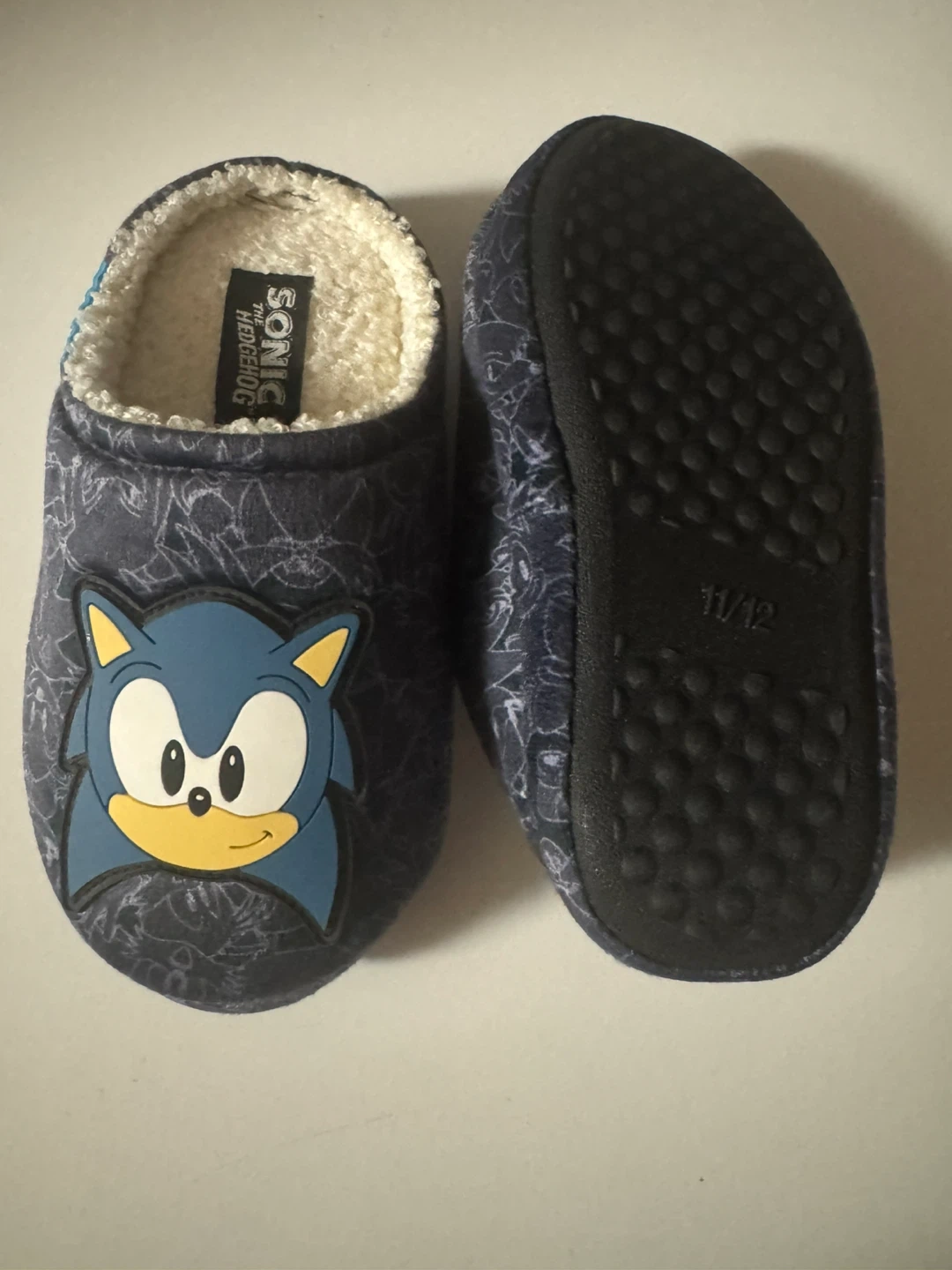 Cozy Sonic the Hedgehog slippers for kids. Features a fun Sonic design on the front with a plush lining for warmth. The sole has a textured grip. Size 11/12.