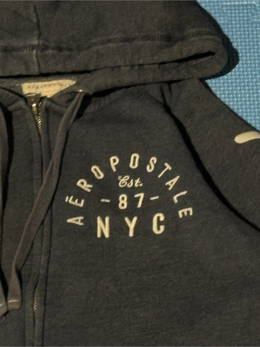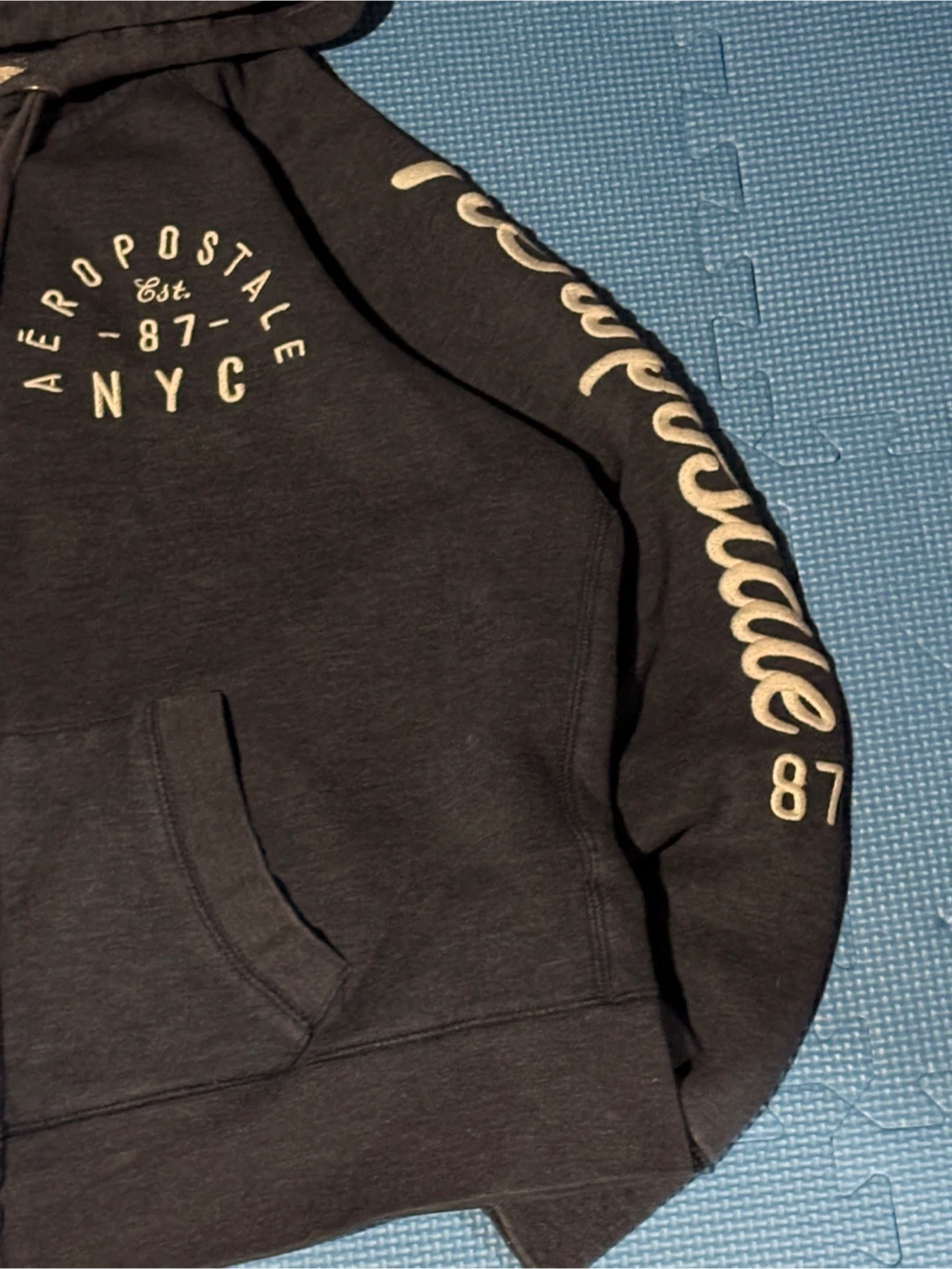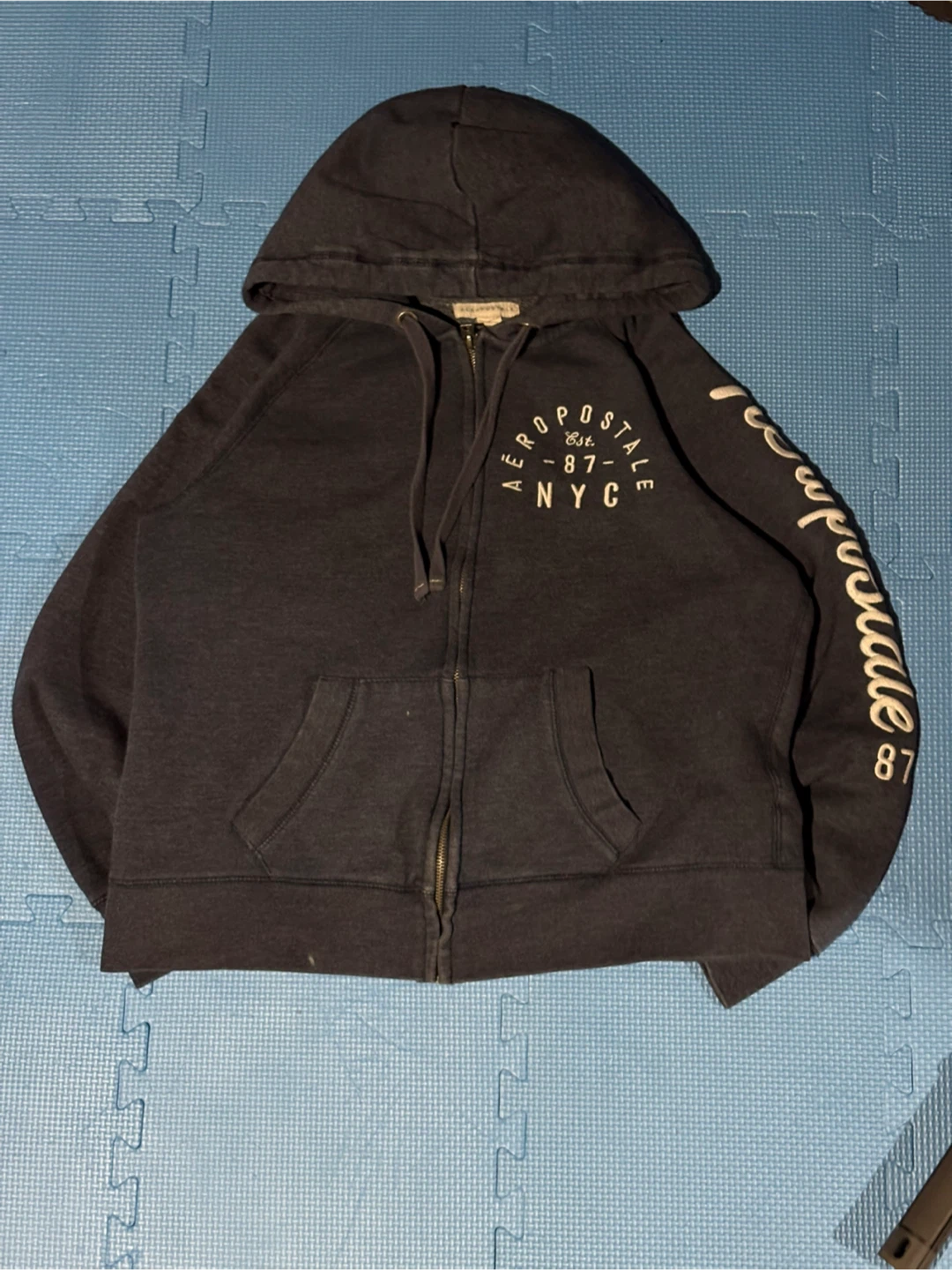 This is a dark grey Aeropostale zip-up hoodie. It has 'Aeropostale Est. 87 NYC' printed on the front chest and 'Aeropostale 87' on the sleeve. It's a comfy, casual layer.