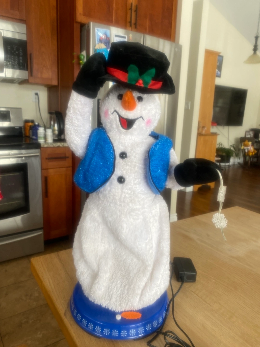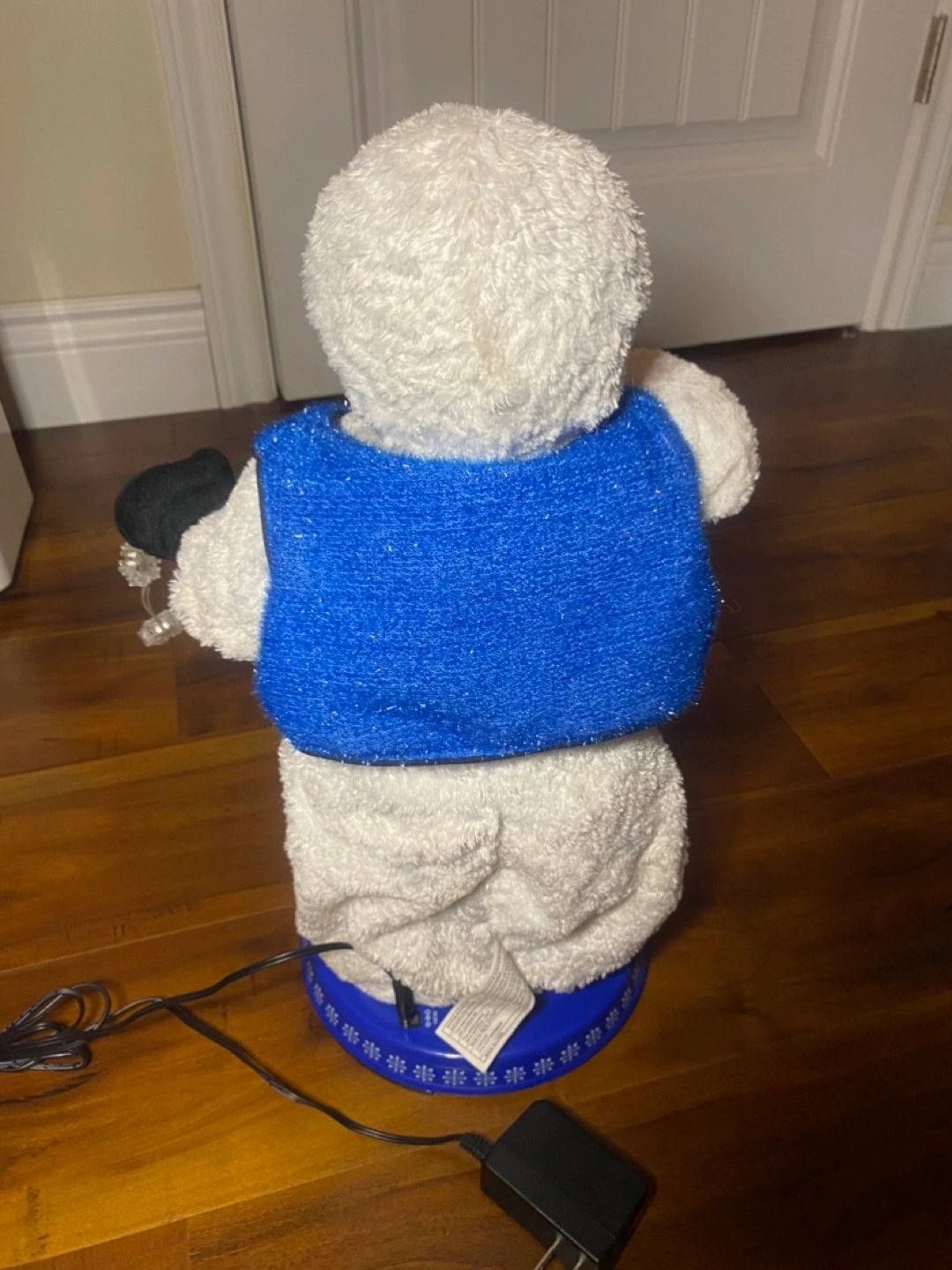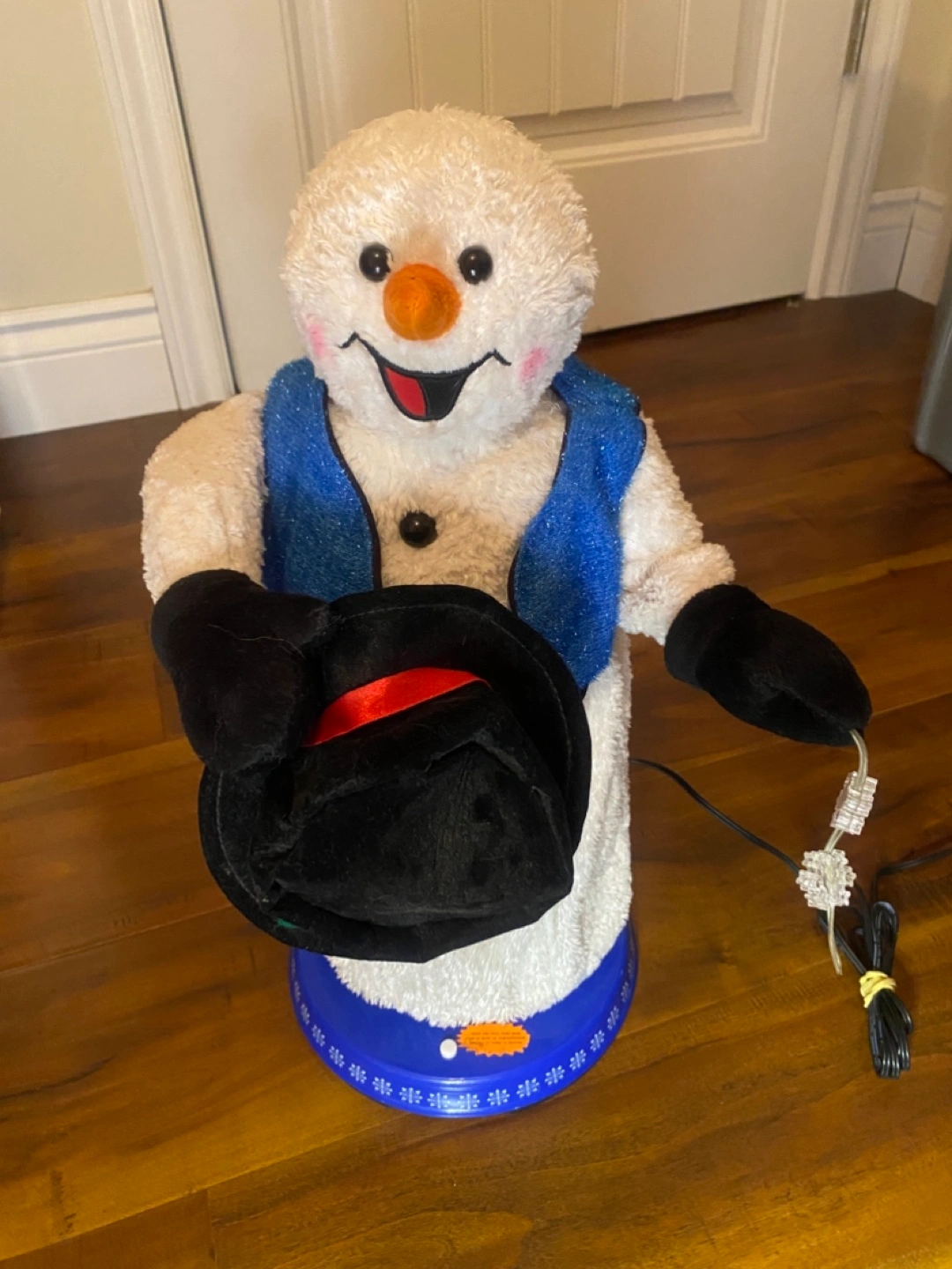Adorable plush snowman decoration vintage and rare . Features a blue vest and black top hat. Mr snowman also tips his hat when he is dancing and singing . Does take batteries or you can just plug it in . Great for winter season !