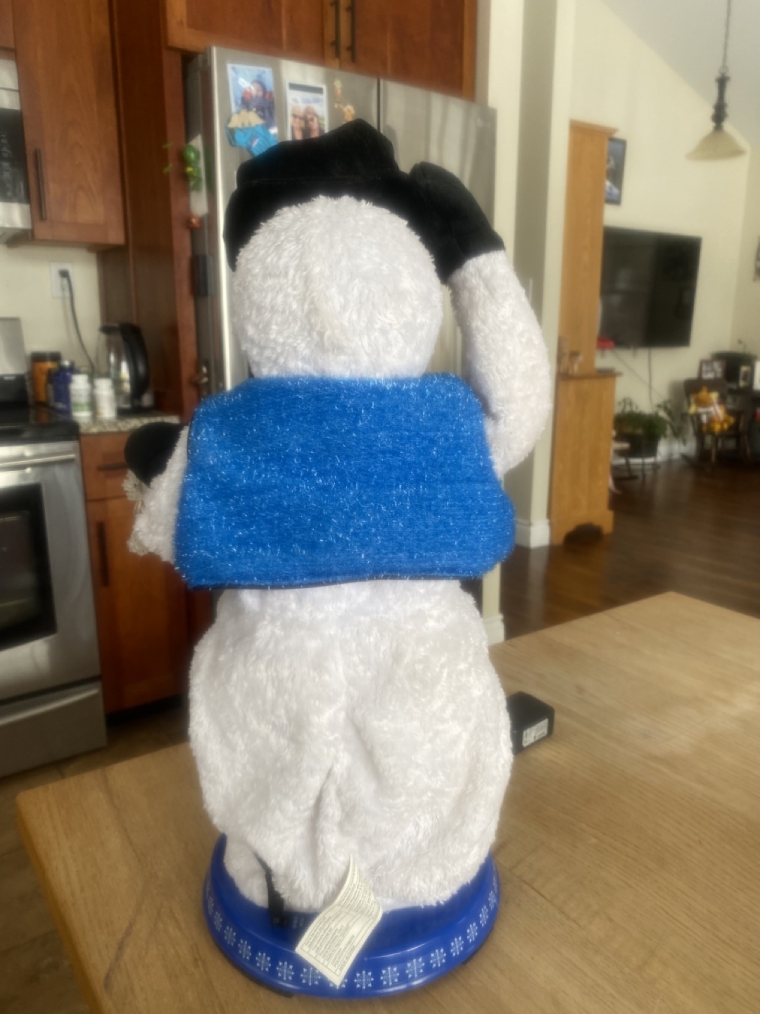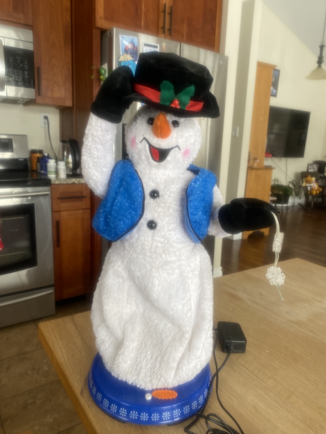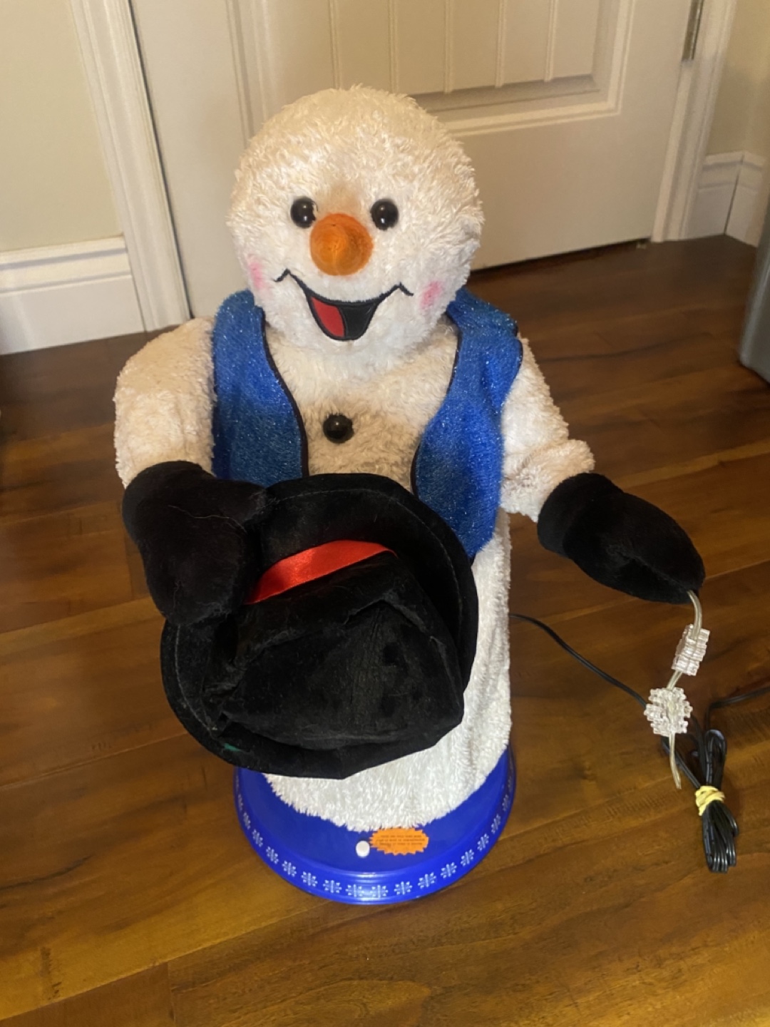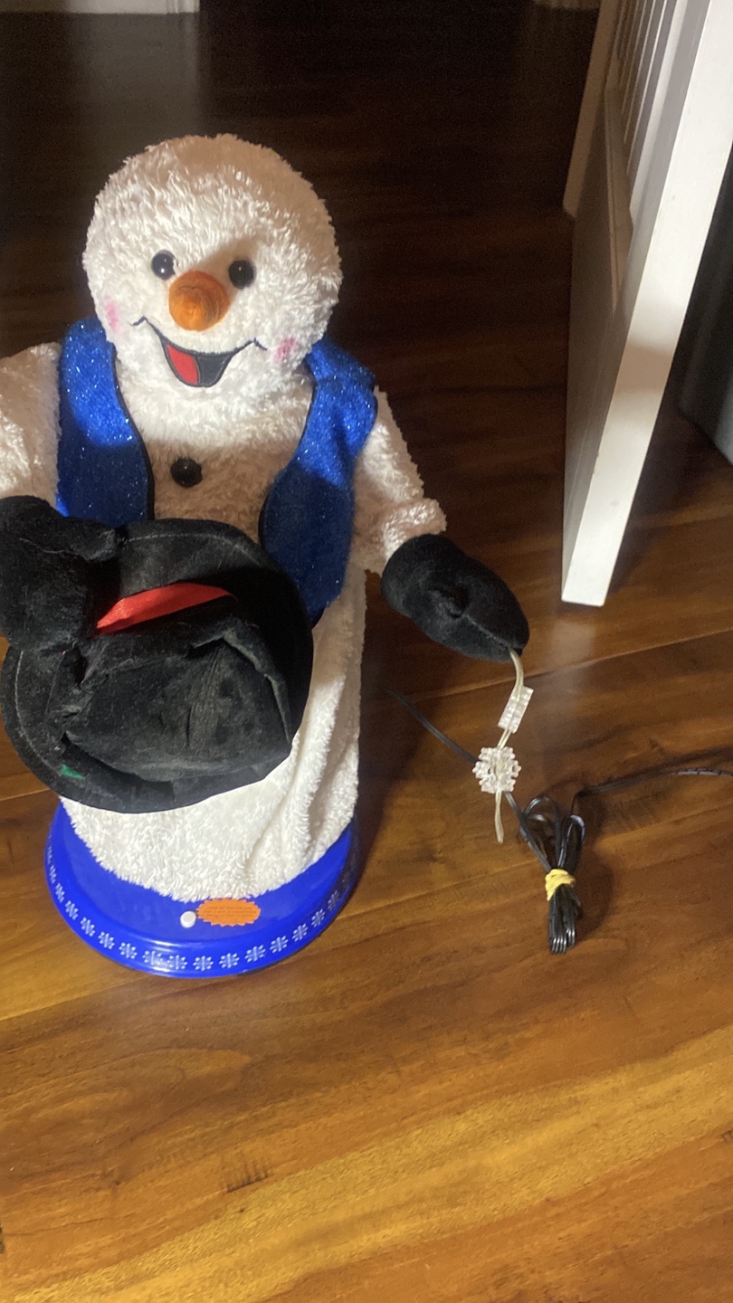 Adorable plush snowman decoration vintage and rare . Features a blue vest and black top hat. Mr snowman also tips his hat when he is dancing and singing . Does take batteries or you can just plug it in . Great for winter season !