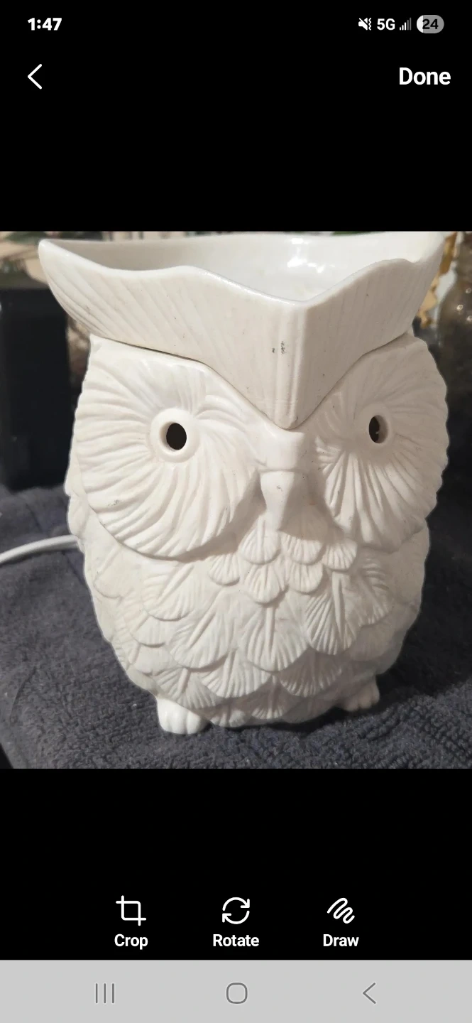 This cute owl-shaped ceramic warmer is perfect for melting wax tarts or essential oils. It's made of white ceramic and has a detailed feather design. Simply place a wax melt or oil in the top dish and plug it in!