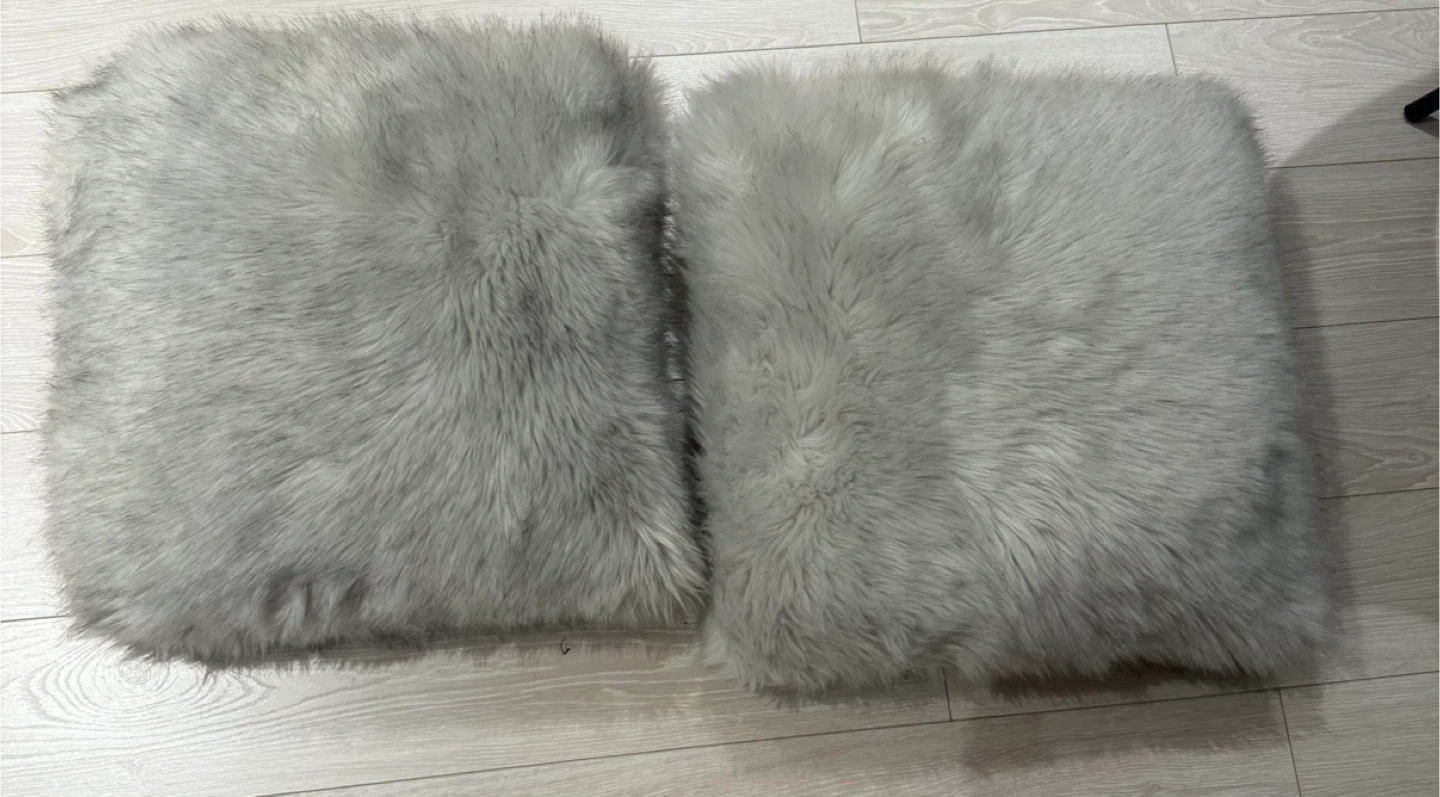 Two square throw pillow covers with a soft grey faux fur texture. These covers add a cozy and stylish touch to any living space. Easy to put on and take off for cleaning. Faux fur material.