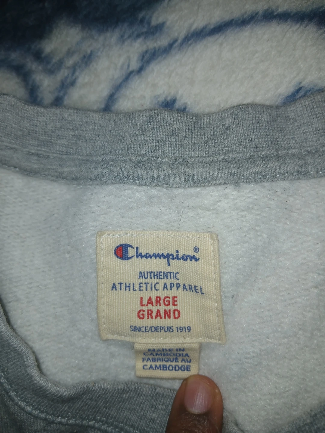 Champion authentic athletic apparel crewneck sweatshirt in grey. It's a size large with a large embroidered Champion logo on the front. This sweatshirt is made from a comfortable fabric blend.