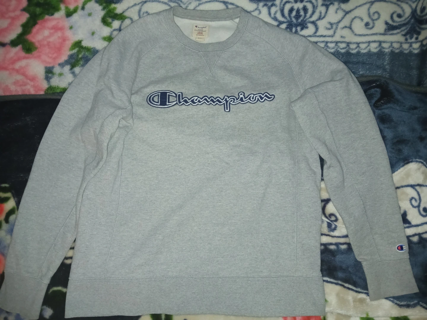 Champion authentic athletic apparel crewneck sweatshirt in grey. It's a size large with a large embroidered Champion logo on the front. This sweatshirt is made from a comfortable fabric blend.