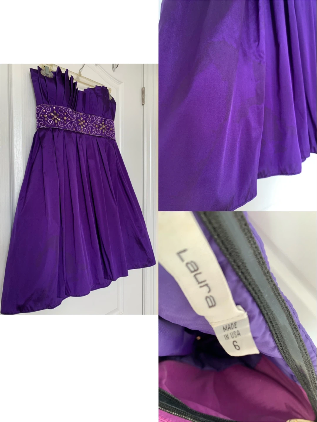 Selling a cute purple dress from Laura in size 6. It's a strapless dress features intricate embellishments with crystals waist detail.